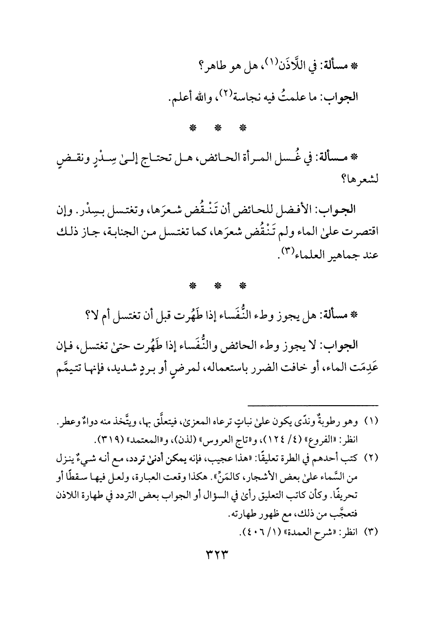 (¬٢) كتب أحدهم في الطرة تعليقًا: "هذا عجيب، فإنه يمكن أدنى تردد، مع أنه شيءٌ ينزل من السَّماء على بعض الأشجار، كالمَنِّ". هكذا وقعت العبارة، ولعل فيها سقطًا أو تحريفًا. وكأن كاتب التعليق رأى في السؤال أو الجواب بعض التردد في طهارة اللاذن فتعجَّب من ذلك، مع ظهور طهارته.