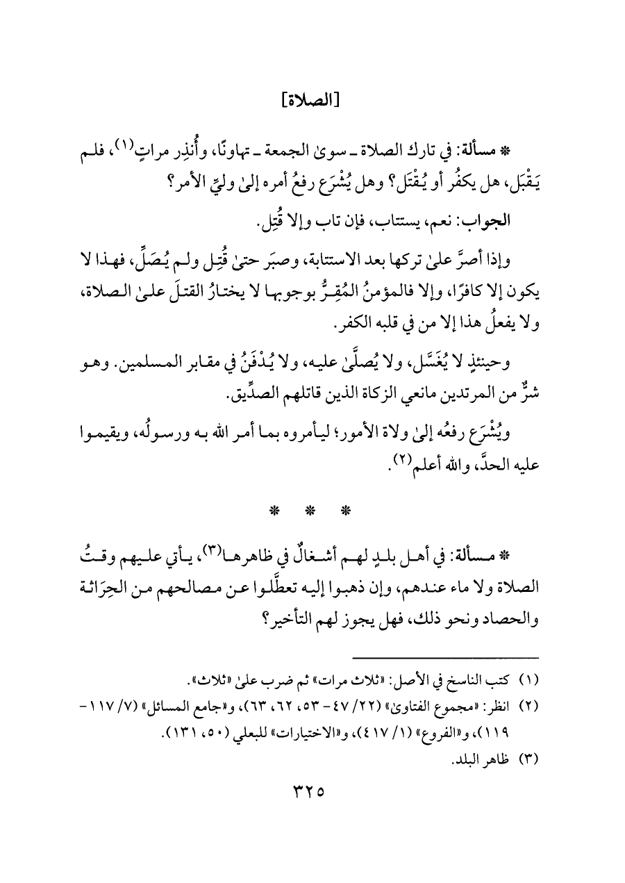 * مسألة: في تارك الصلاة ــ سوى الجمعة ــ تهاونًا، وأُنذِر مراتٍ (¬١)، فلم يَقْبَل، هل يكفُر أو يُقْتَل؟ وهل يُشْرَع رفعُ أمره إلى وليِّ الأمر؟