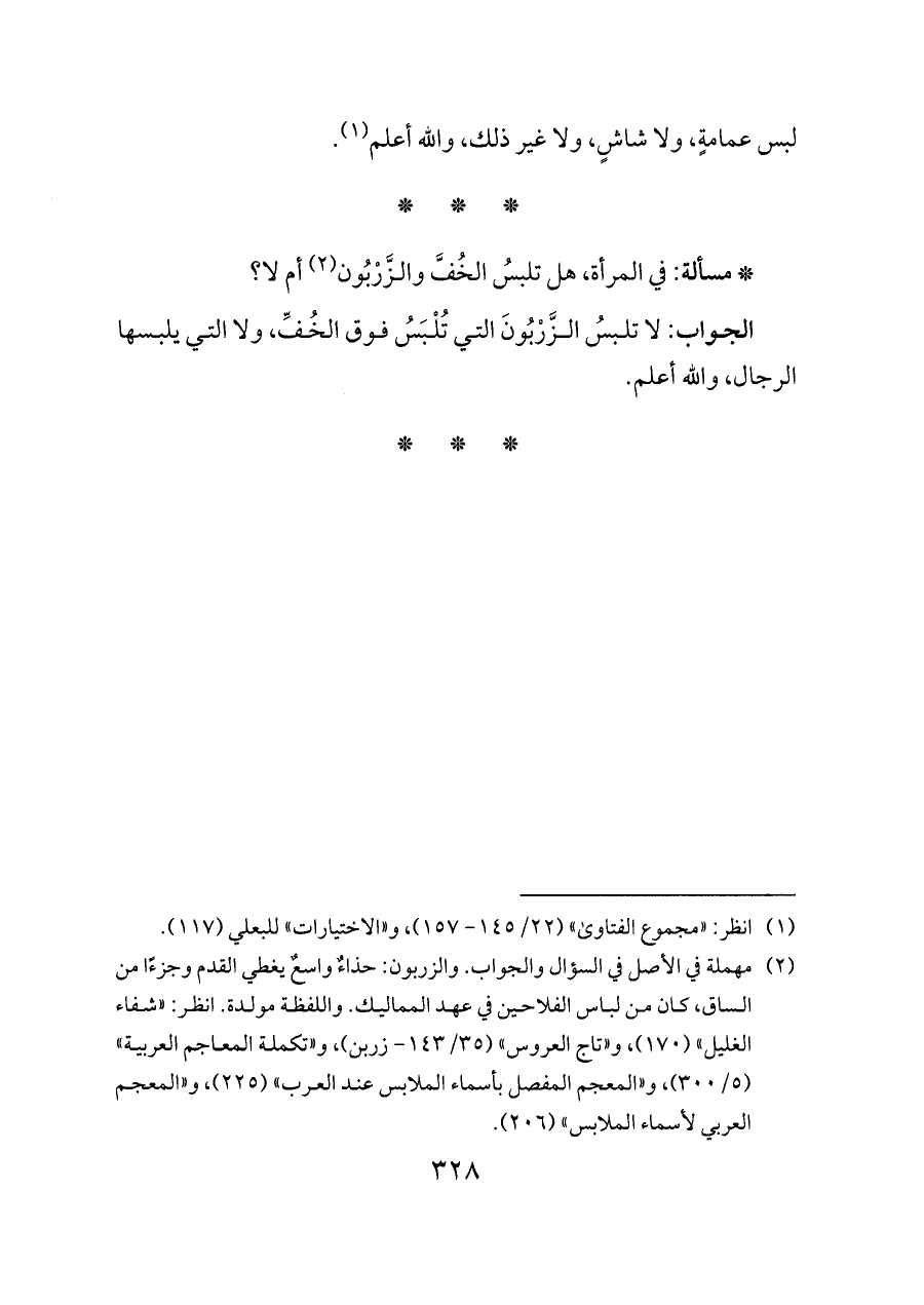 (¬٢) مهملة في الأصل في السؤال والجواب. والزربون: حذاءٌ واسعٌ يغطي القدم وجزءًا من الساق، كان من لباس الفلاحين في عهد المماليك. واللفظة مولدة. انظر: "شفاء الغليل" (١٧٠)، و"تاج العروس" (٣٥/ ١٤٣ - زربن)، و"تكملة المعاجم العربية" (٥/ ٣٠٠)، و"المعجم المفصل بأسماء الملابس عند العرب" (٢٢٥)، و"المعجم العربي لأسماء الملابس" (٢٠٦).