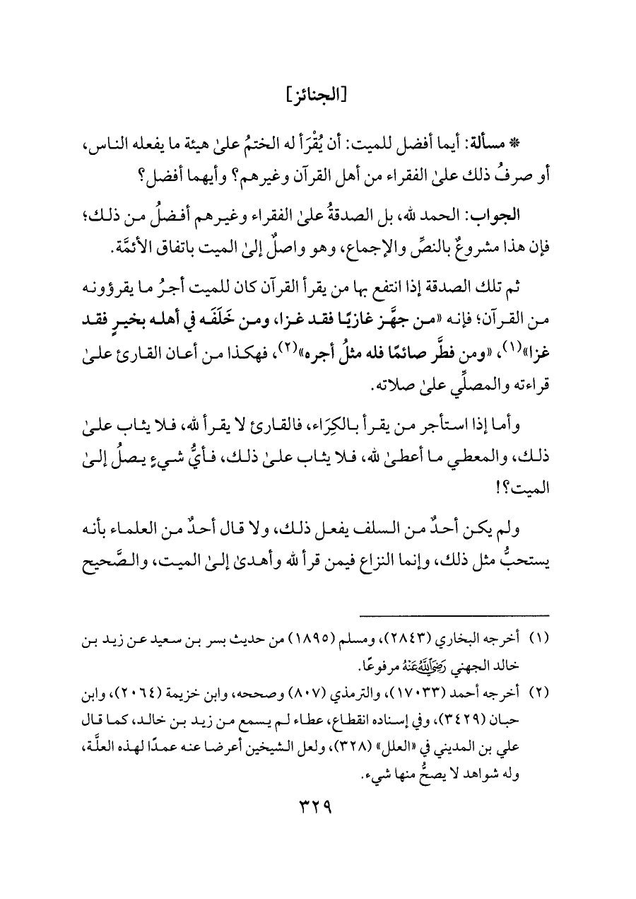 * مسألة: أيما أفضل للميت: أن يُقْرَأ له الختمُ على هيئة ما يفعله الناس, أو صرفُ ذلك على الفقراء من أهل القرآن وغيرهم؟ وأيهما أفضل؟