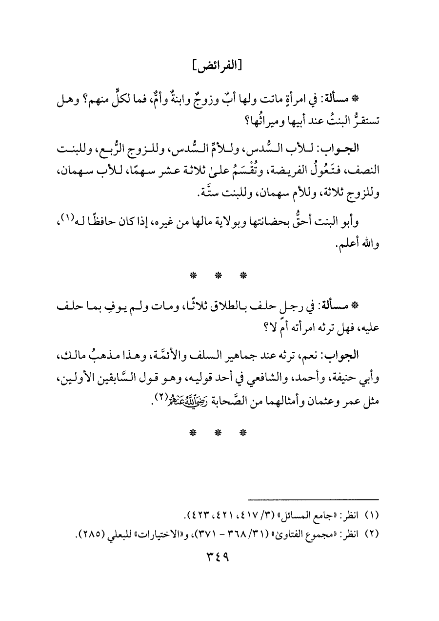 الجواب: نعم، ترثه عند جماهير السلف والأئمَّة، وهذا مذهبُ مالك، وأبي حنيفة، وأحمد، والشافعي في أحد قوليه، وهو قول السَّابقين الأولين، مثل عمر وعثمان وأمثالهما من الصَّحابة - رضي الله عنهم - (¬٢).