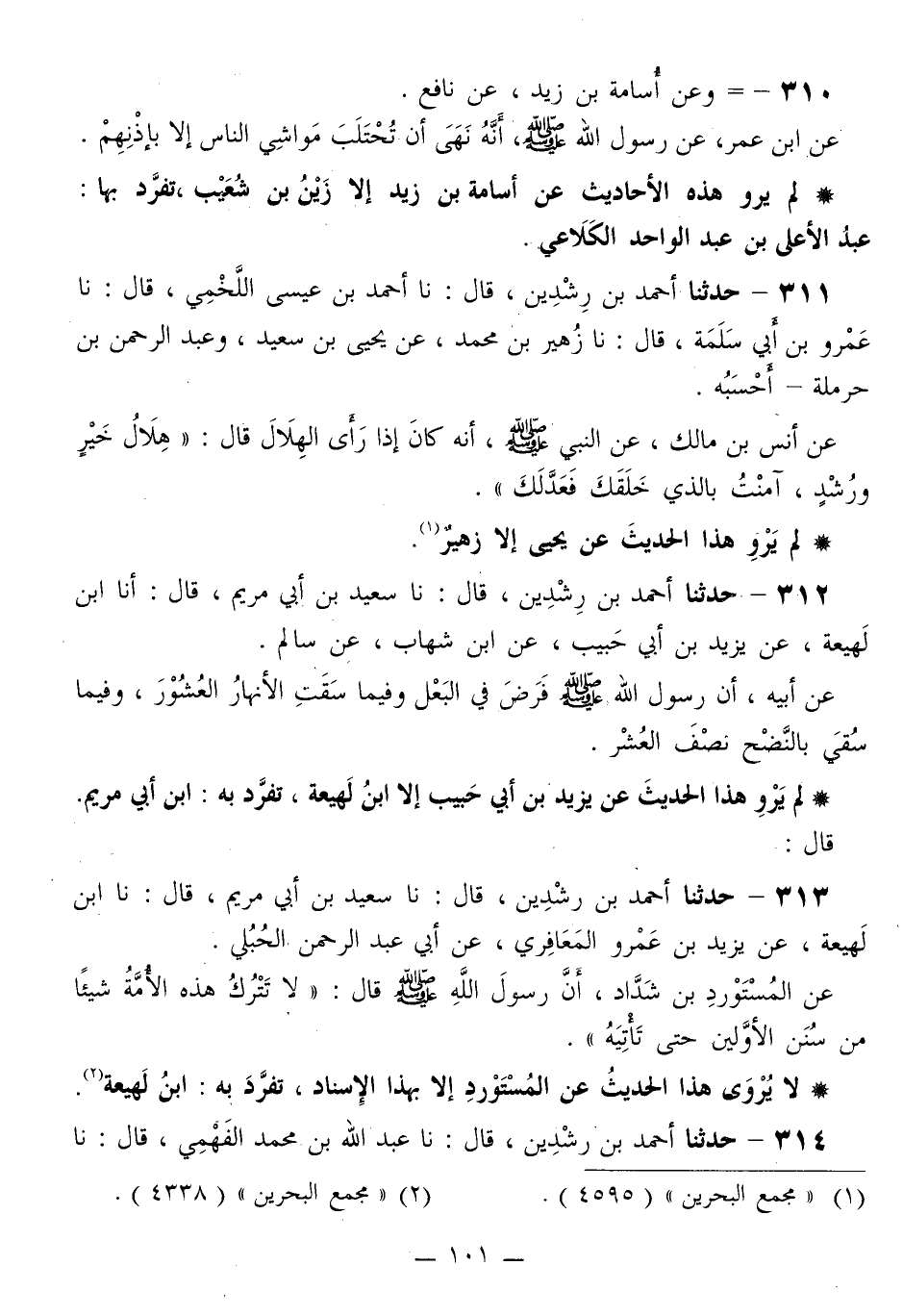 313 - قَالَ: حَدَّثَنَا أَحْمَدُ بْنُ رِشْدِينَ قَالَ: نا سَعِيدُ بْنُ أَبِي مَرْيَمَ قَالَ: نا ابْنُ لَهِيعَةَ، عَنْ يَزِيدَ بْنِ عَمْرٍو الْمَعَافِرِيِّ، عَنْ أَبِي عَبْدِ الرَّحْمَنِ الْحُبُلِيِّ، عَنِ الْمُسْتَوْرِدِ بْنِ شَدَّادٍ، أَنَّ رَسُولَ اللَّهِ صَلَّى اللهُ عَلَيْهِ وَسَلَّمَ قَالَ: «§لَا تَتْرُكُ هَذِهِ الْأُمَّةُ شَيْئًا مِنْ سَنَنِ الْأَوَّلِينَ حَتَّى تَأْتِيَهُ»
