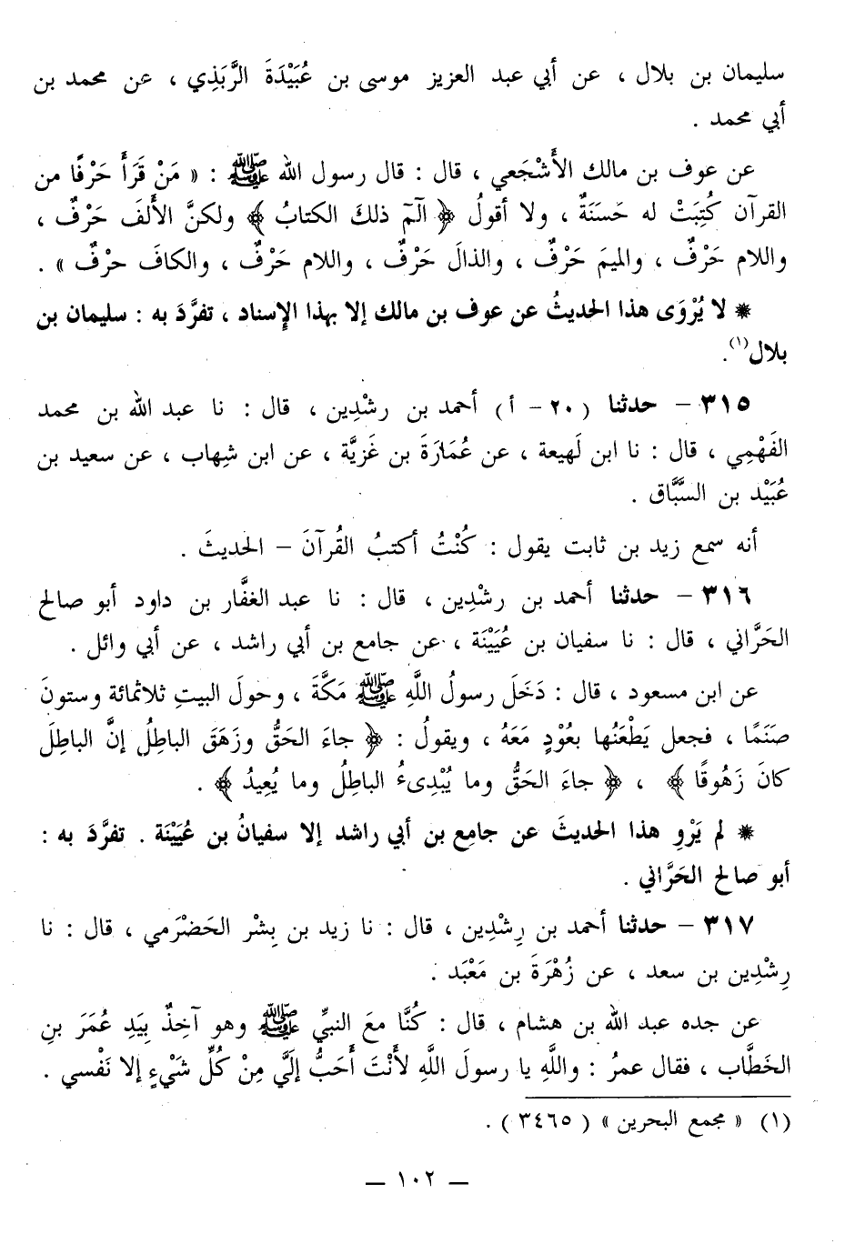 317 - حَدَّثَنَا أَحْمَدُ بْنُ رِشْدِينَ قَالَ: نا زَيْدُ بْنُ بِشْرٍ الْحَضْرَمِيُّ قَالَ: نا رِشْدِينُ بْنُ سَعْدٍ، عَنْ زُهْرَةَ بْنِ مَعْبَدٍ، عَنْ جَدِّهِ عَبْدِ اللَّهِ بْنِ هِشَامٍ قَالَ: كُنَّا مَعَ النَّبِيِّ صَلَّى اللهُ عَلَيْهِ وَسَلَّمَ وَهُوَ آخِذٌ بَيْدِ عُمَرَ بْنِ الْخَطَّابِ، فَقَالَ عُمَرُ: وَاللَّهِ يَا رَسُولَ اللَّهِ لَأَنْتَ أَحَبُّ إِلَيَّ مِنْ كُلِّ شَيْءٍ إِلَّا نَفْسِي. -[103]- فَقَالَ: «لَا , وَالَّذِي نَفْسِي بِيَدِهِ، §حَتَّى أَكُونَ أَحَبَّ إِلَيْكَ مِنْ نَفْسِكَ» . قَالَ عُمَرُ: فَأَنْتَ الْآنَ أَحَبُّ إِلَيَّ مِنْ نَفْسِي. فَقَالَ رَسُولُ اللَّهِ صَلَّى اللهُ عَلَيْهِ وَسَلَّمَ: «الْآنَ يَا عُمَرُ»