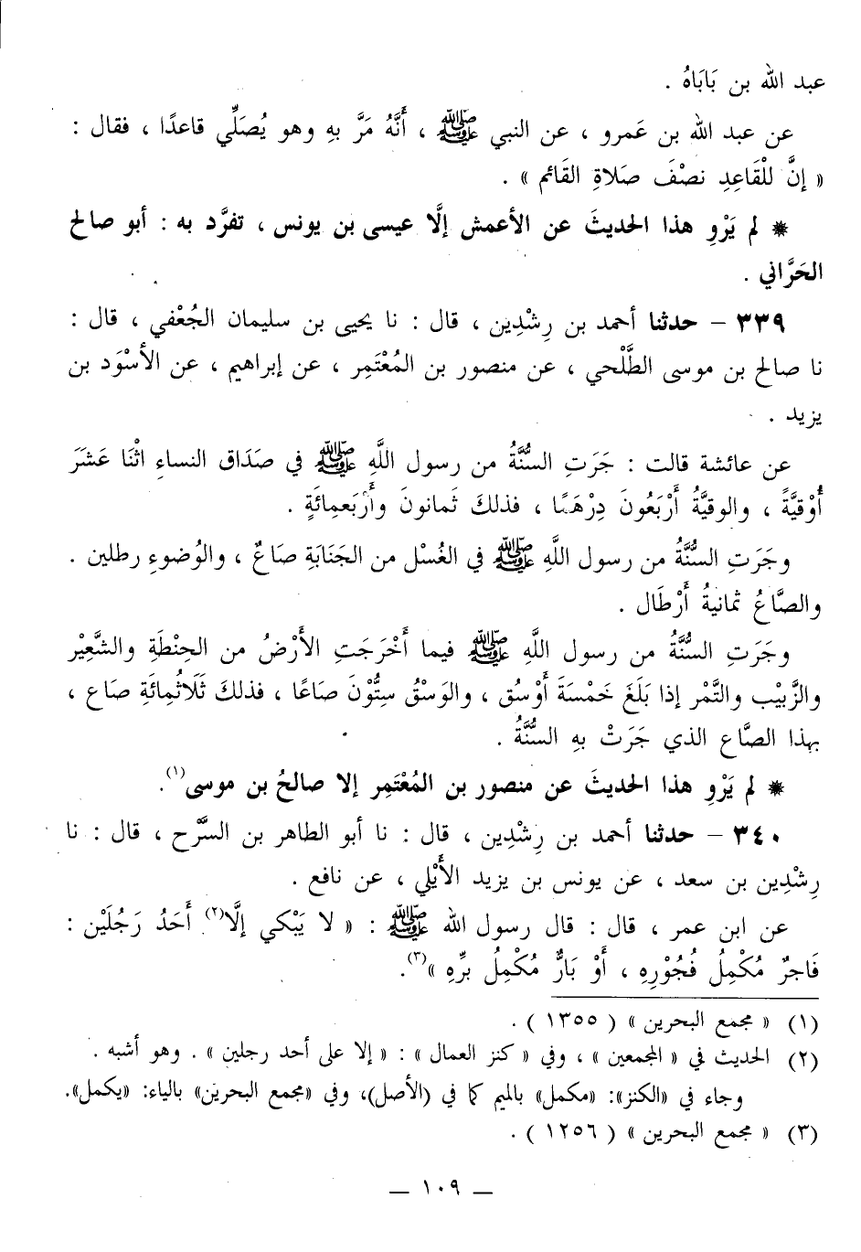 339 - حَدَّثَنَا أَحْمَدُ بْنُ رِشْدِينَ قَالَ: نا يَحْيَى بْنُ سُلَيْمَانَ الْجُعْفِيُّ قَالَ: نا صَالِحُ بْنُ مُوسَى الطَّلْحِيُّ، عَنْ مَنْصُورِ بْنِ الْمُعْتَمِرِ، عَنْ إِبْرَاهِيمَ، عَنِ الْأَسْوَدِ بْنِ يَزِيدَ، عَنْ عَائِشَةَ، قَالَتْ: جَرَتِ السُّنَةُ مِنْ رَسُولِ اللَّهِ صَلَّى اللهُ عَلَيْهِ وَسَلَّمَ فِي «§صَدَاقِ النِّسَاءِ اثْنَتَا عَشْرَةَ أُوقِيَّةً، وَالْوَقِيَّةُ: أَرْبَعُونَ دِرْهَمًا، فَذَلِكَ ثَمَانُونَ وأَرْبَعُمائةٌ»