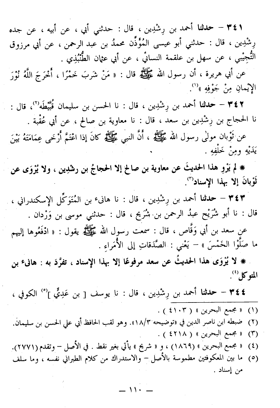 341 - حَدَّثَنَا أَحْمَدُ بْنُ رِشْدِينَ قَالَ: حَدَّثَنِي أَبِي، عَنْ أَبِيهِ، عَنْ جَدِّهِ رِشْدِينَ قَالَ: حَدَّثَنِي أَبُو عِيسَى الْمُؤَذِّنُ مُحَمَّدُ بْنُ عَبْدِ الرَّحْمَنِ، عَنْ أَبِي مَرْزُوقٍ التُّجِيبِيِّ، عَنْ سَهْلِ بْنِ عَلْقَمَةَ النَّسَائِيِّ، عَنْ أَبِي عُثْمَانَ الطُّنْبُذِيِّ، عَنْ أَبِي هُرَيْرَةَ، أَنَّ رَسُولَ اللَّهِ صَلَّى اللهُ عَلَيْهِ وَسَلَّمَ قَالَ: «§مَنْ شَرِبَ خَمْرًا، أَخْرَجَ اللَّهُ نُورَ الْإِيمَانِ مِنْ جَوْفِهِ»