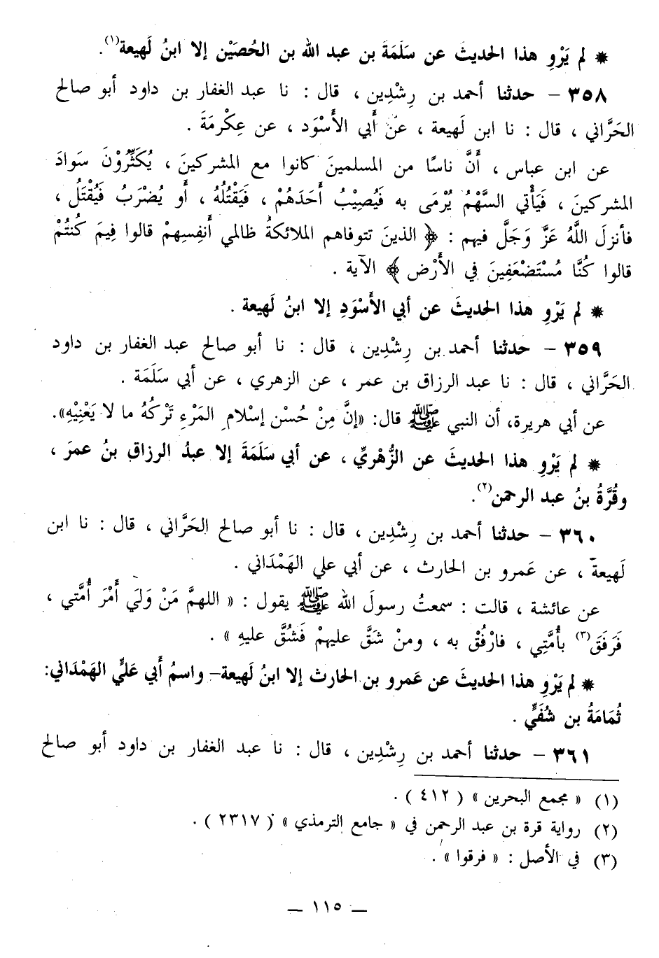 359 - حَدَّثَنَا أَحْمَدُ بْنُ رِشْدِينَ قَالَ: نا أَبُو صَالِحٍ عَبْدُ الْغَفَّارِ بْنُ دَاوُدَ الْحَرَّانِيُّ قَالَ: نا عَبْدُ الرَّزَّاقِ بْنُ عُمَرَ، عَنِ الزُّهْرِيِّ، عَنْ أَبِي سَلَمَةَ، عَنْ أَبِي هُرَيْرَةَ، أَنَّ النَّبِيَّ صَلَّى اللهُ عَلَيْهِ وَسَلَّمَ قَالَ: «إِنَّ §مِنْ حُسْنِ إِسْلَامِ الْمَرْءِ تَرَكُهُ مَالِا يَعْنِيهِ»