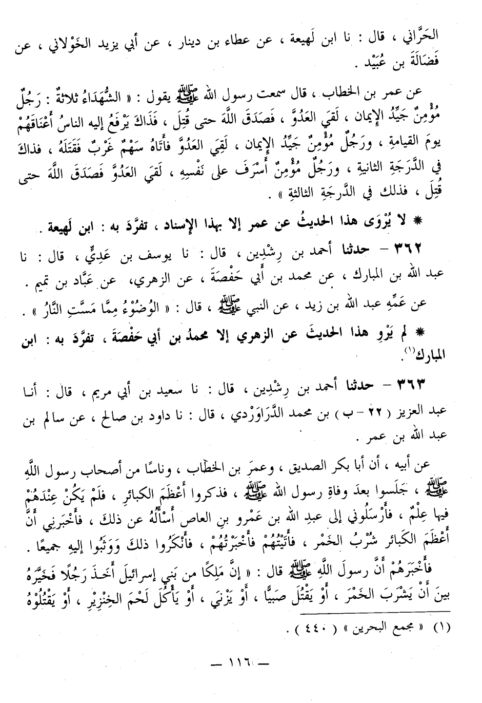 363 - حَدَّثَنَا أَحْمَدُ بْنُ رِشْدِينَ قَالَ: نا سَعِيدُ بْنُ أَبِي مَرْيَمَ قَالَ: أَنَا عَبْدُ الْعَزِيزِ بْنُ مُحَمَّدٍ الدَّرَاوَرْدِيُّ قَالَ: نا دَاوُدُ بْنُ صَالِحٍ، عَنْ سَالِمِ بْنِ عَبْدِ اللَّهِ بْنِ عُمَرَ، عَنْ أَبِيهِ، أَنَّ أَبَا بَكْرٍ الصِّدِّيقَ، وَعُمَرَ بْنَ الْخَطَّابِ، وَنَاسًا مِنْ أَصْحَابِ رَسُولِ اللَّهِ صَلَّى اللهُ عَلَيْهِ وَسَلَّمَ، جَلَسُوا بَعْدَ وَفَاةِ رَسُولِ اللَّهِ صَلَّى اللهُ عَلَيْهِ وَسَلَّمَ، فَذَكَرُوا أَعْظَمَ الْكَبَائِرِ، فَلَمْ يَكُنْ عِنْدَهُمْ فِيهَا عِلْمٌ، فَأَرْسَلُونِي إِلَى عَبْدِ اللَّهِ بْنِ عَمْرِو بْنِ الْعَاصِ أَسْأَلَهُ عَنْ ذَلِكَ، فَأَخْبَرَنِي أَنَّ أَعْظَمَ الْكَبَائِرِ شُرْبَ الْخَمْرِ، فَأَتَيْتُهُمْ فَأَخْبَرْتُهُمْ، فَأَنْكَرُوا ذَلِكَ وَوَثَبُوا إِلَيْهِ جَمِيعًا. فَأَخْبَرَهُمْ أَنَّ رَسُولَ اللَّهِ صَلَّى اللهُ عَلَيْهِ وَسَلَّمَ قَالَ: «إِنَّ مَلِكًا مِنْ بَنِي إِسْرَائِيلَ أخذ رَجُلًا فَخَيَّرَهُ بَيْنَ أَنْ يَشْرَبَ الْخَمْرَ، أَوْ يَقْتُلَ صَبِيًّا، أَوْ يَزْنِيَ، أَوْ يَأْكُلَ لَحْمَ الْخِنْزِيرِ، أَوْ يَقْتُلُوهُ -[117]- إِنْ أَبَى. فَاخْتَارَ أَنَّهُ يَشْرَبُ الْخَمْرَ، وَأَنَّهُ لَمَّا شَرِبَ، لَمْ يَمْتَنِعْ مِنْ شَيْءٍ أرادوهُ مِنْهُ» . وَأَنَّ رَسُولَ اللَّهِ صَلَّى اللهُ عَلَيْهِ وَسَلَّمَ قَالَ لَنَا حِينَئِذٍ: «§مَا مِنْ أَحَدٍ يَشْرَبُهَا فَتُقْبَلُ لَهُ صَلَاةٌ أَرْبَعِينَ لَيْلَةً، وَلَا يَمُوتُ وَفِي مَثَانَتِهِ مِنْهَا شَيْءٌ إِلَّا حُرِّمَتْ عَلَيْهِ الْجَنَّةُ، وَإِنْ مَاتَ فِي الْأَرْبَعِينَ مَاتَ مِيتَةً جَاهِلِيَّةً» . لَا يُرْوَى هَذَا الْحَدِيثُ عَنْ عَبْدِ اللَّهِ بْنِ عُمَرَ، عَنْ عَبْدِ اللَّهِ بْنِ عمر إِلَّا بِهَذَا الْإِسْنَادِ، تَفَرَّدَ بِهِ: الدَّرَاوَرْدِيُّ
