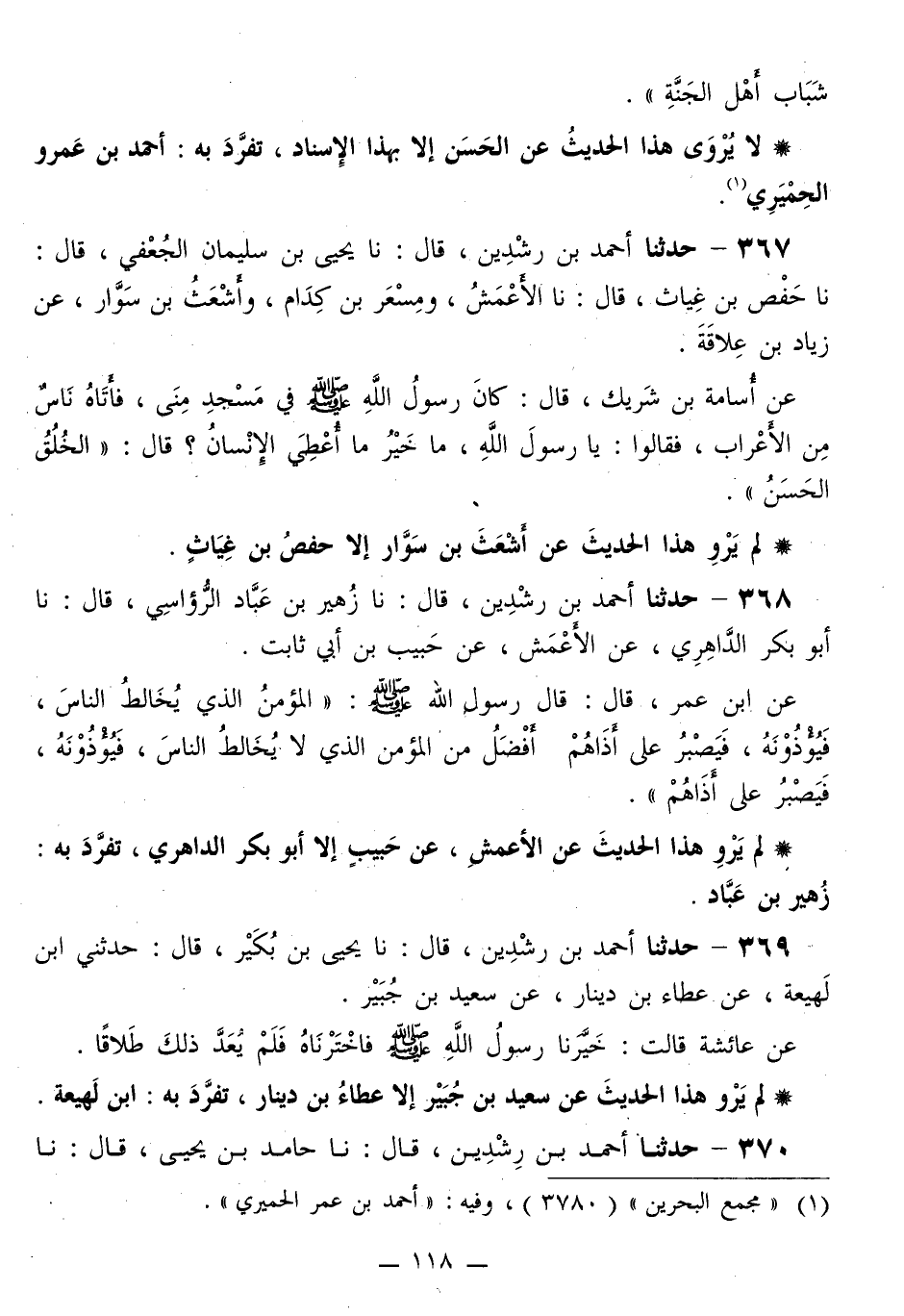 368 - حَدَّثَنَا أَحْمَدُ بْنُ رِشْدِينَ قَالَ: نا زُهَيْرُ بْنُ عَبَّادٍ الرُّؤَاسِيُّ قَالَ: نا أَبُو بَكْرٍ الدَّاهِرِيُّ، عَنِ الْأَعْمَشِ، عَنْ حَبِيبِ بْنِ أَبِي ثَابِتٍ، عَنِ ابْنِ عُمَرَ قَالَ: قَالَ رَسُولُ اللَّهِ صَلَّى اللهُ عَلَيْهِ وَسَلَّمَ: «§الْمُؤْمِنُ الَّذِي يُخَالِطُ النَّاسَ، فَيُؤْذُونَهُ، فَيَصْبِرُ عَلَى أَذَاهُمْ أَفْضَلُ منَ الْمُؤْمِنِ الَّذِي لَا يُخَالِطُ النَّاسُ، فَيُؤْذُونَهُ، فَيَصْبُرُ عَلَى أَذَاهُمْ»