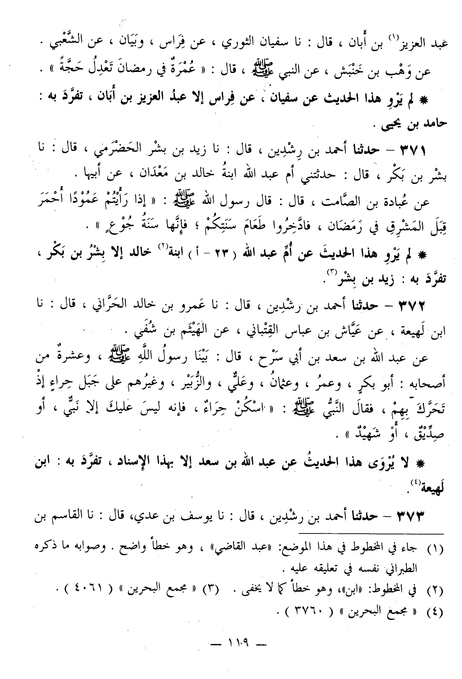 372 - حَدَّثَنَا أَحْمَدُ بْنُ رِشْدِينَ قَالَ: نا عَمْرُو بْنُ خَالِدٍ الْحَرَّانِيُّ قَالَ: نا ابْنُ لَهِيعَةَ، عَنْ عَيَّاشِ بْنِ عَبَّاسٍ الْقِتْبَانِيِّ، عَنِ الْهَيْثَمِ بْنِ شُفَيٍّ، عَنْ عَبْدِ اللَّهِ بْنِ سَعْدِ بْنِ أَبِي سَرْحٍ قَالَ: بَيْنَا رَسُولُ اللَّهِ صَلَّى اللهُ عَلَيْهِ وَسَلَّمَ، وَعَشَرَةٌ مِنْ أَصْحَابِهِ: أَبُو بَكْرٍ، وَعُمَرُ، وَعُثْمَانُ، وَعَلِيٌّ، وَالزُّبَيْرُ، وَغَيْرُهُمْ عَلَى جَبَلِ حِرَاءٍ إِذْ تَحَرَّكَ بِهِمْ، فَقَالَ النَّبِيُّ صَلَّى اللهُ عَلَيْهِ وَسَلَّمَ: «§اسْكُنْ حِرَاءُ، فَإِنَّهُ لَيْسَ عَلَيْكَ إِلَّا نَبِيٌّ، أَوْ صِدِّيقٌ، أَوْ شَهِيدٌ»