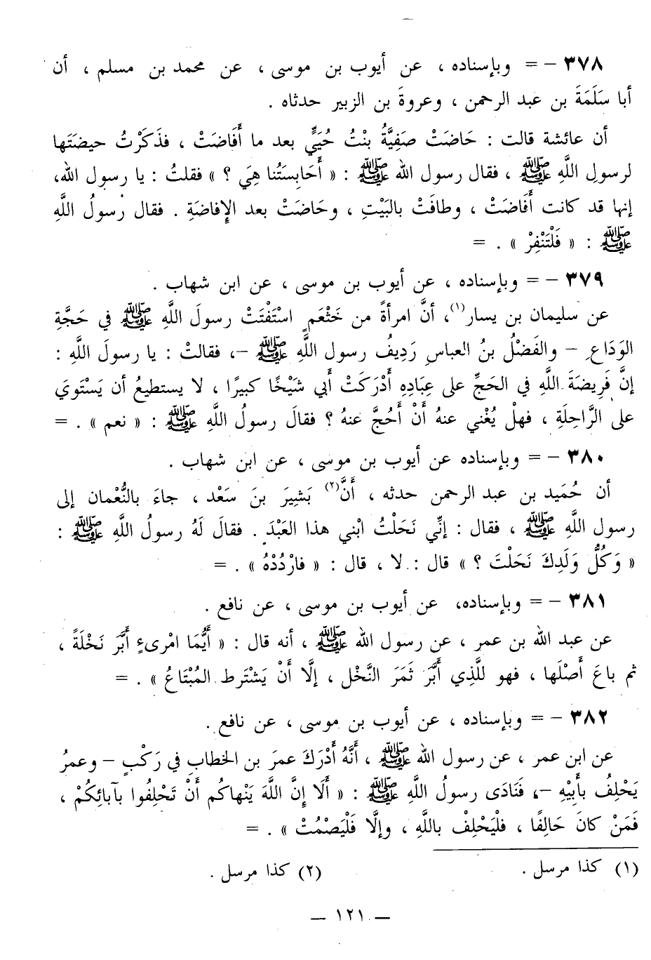 378 - وَبِإِسْنَادِهِ، عَنْ أَيُّوبَ بْنِ مُوسَى، عَنْ مُحَمَّدِ بْنِ مُسْلِمٍ، أَنَّ أَبَا سَلَمَةَ بْنَ عَبْدِ الرَّحْمَنِ، وَعُرْوَةَ بْنَ الزُّبَيْرِ، حَدَّثَاهُ. أَنَّ عَائِشَةَ قَالَتْ: حَاضَتْ صَفِيَّةُ بِنْتُ حُيَيٍّ بَعْدَمَا أَفَاضَتْ، فَذَكَرْتُ حَيْضَتَهَا لِرَسُولِ اللَّهِ صَلَّى اللهُ عَلَيْهِ وَسَلَّمَ، فَقَالَ رَسُولُ اللَّهِ صَلَّى اللهُ عَلَيْهِ وَسَلَّمَ: «أَحَابِسَتُنَا هِيَ؟» فَقُلْتُ: يَا رَسُولَ اللَّهِ، إِنَّهَا كَانَتْ §أَفَاضَتْ، وَطَافَتْ بِالْبَيْتِ، وَحَاضَتْ بَعْدَ الْإِفَاضَةِ. فَقَالَ رَسُولُ اللَّهِ صَلَّى اللهُ عَلَيْهِ وَسَلَّمَ: «فَلْتَنْفِرْ»