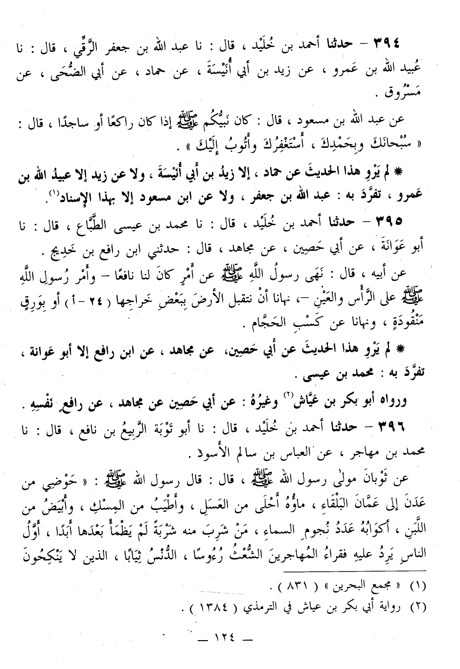 394 - حَدَّثَنَا أَحْمَدُ بْنُ خُلَيْدٍ قَالَ: نا عَبْدُ اللَّهِ بْنُ جَعْفَرٍ الرَّقِّيُّ قَالَ: نا عُبَيْدُ اللَّهِ بْنُ عَمْرٍو، عَنْ زَيْدِ بْنِ أَبِي أُنَيْسَةَ، عَنْ حَمَّادٍ، عَنْ أَبِي الضُّحَى، عَنْ مَسْرُوقٍ، عَنْ عَبْدِ اللَّهِ بْنِ مَسْعُودٍ قَالَ: كَانَ نَبِيُّكُمْ صَلَّى اللهُ عَلَيْهِ وَسَلَّمَ إِذَا كَانَ رَاكِعًا أَوْ سَاجِدًا قَالَ: «§سُبْحَانَكَ وَبِحَمْدِكَ، أَسْتَغْفِرُكَ وَأَتُوبُ إِلَيْكَ»