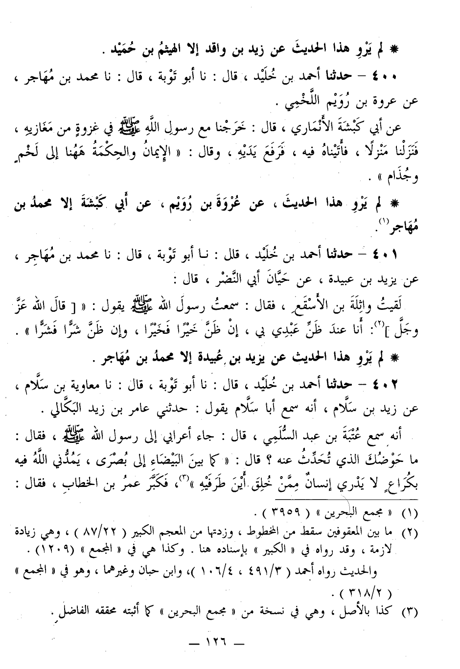 402 - حَدَّثَنَا أَحْمَدُ بْنُ خُلَيْدٍ قَالَ: نا أَبُو تَوْبَةَ قَالَ: نا مُعَاوِيَةُ بْنُ سَلَّامٍ، عَنْ زَيْدِ بْنِ سَلَّامٍ، أَنَّهُ سَمِعَ أَبَا سَلَّامٍ، يَقُولُ: حَدَّثَنِي عَامِرُ بْنُ زَيْدٍ الْبَكَالِيُّ،. أَنَّهُ سَمِعَ عُتْبَةَ بْنَ عَبْدٍ السُّلَمِيَّ قَالَ: جَاءَ أَعْرَابِيٌّ إِلَى رَسُولِ اللَّهِ صَلَّى اللهُ عَلَيْهِ وَسَلَّمَ فَقَالَ: مَا حَوْضُكَ الَّذِي تُحَدِّثُ عَنْهُ؟ قَالَ: «§كَمَا بَيْنَ الْبَيْضَاءِ إِلَى بُصْرَى، يَمُدُّني اللَّهُ فِيهِ بِكُرَاعٍ لَا يَدْرِي إِنْسَانٌ مِمَّنْ خُلِقَ أَيْنَ طَرَفَيْهِ» . فَكَبَّرَ عُمَرُ بْنُ الْخَطَّابِ، فَقَالَ: -[127]- أَمَّا الْحَوْضُ فَيَرِدُ عَلَيْهِ فُقَرَاءُ الْمُهَاجِرِينَ، الَّذِينَ يُقَاتِلُونَ فِي سَبِيلِ اللَّهِ، ويَمُوتُونَ فِي سَبِيلِ اللَّهِ. فَأَرْجُو أَنْ يُورِثْني الْكُرَاعَ فَأَشْرَبَ مِنْهُ. وَقَالَ رَسُولُ اللَّهِ صَلَّى اللهُ عَلَيْهِ وَسَلَّمَ: «إِنَّ رَبِّي وَعَدَنِي أَنْ يُدْخِلَ الْجَنَّةَ مِنْ أُمَّتِي سَبْعِينَ أَلْفًا بِغَيْرِ حِسَابٍ ثُمَّ يَشْفَعُ كُلُّ أَلْفٍ لِسَبْعِينَ أَلْفًا، ثُمَّ يَحْثِي رَبِّي تَبَارَكَ وَتَعَالَى بِكَفَّيْهِ ثَلَاثَ حَثَيَاتٍ» . فَكَبَّرَ عُمَرُ، وَقَالَ: إِنَّ السَّبْعِينَ الْأُولَى لَيُشَفِّعُهُمُ اللَّهُ فِي آبَائِهِمْ، وَأَبْنَائِهِمْ، وَعَشَائِرِهِمْ، وَأَرْجُو أَنْ يَجْعَلَنِي اللَّهُ فِي إِحْدَى الْحَثَيَاتِ الْأَوَاخِرِ. فَقَالَ الْأَعْرَابِيُّ: يَا رَسُولَ اللَّهِ، فِيهَا فَاكِهَةٌ؟ قَالَ: «نَعَمْ، وَفِيهَا شَجَرَةٌ تُدْعَى طُوبَى هِيَ تُطَابِقُ الْفِرْدَوْسَ» . فَقَالَ: أَيُّ شَجَرِ أَرْضِنَا تُشْبِهُ؟ قَالَ: «لَيْسَ تُشْبِهُ مِنْ شَجَرِ أَرْضِكَ، وَلَكِنْ أَتَيْتَ الشَّامَ؟» قَالَ: لَا، يَا رَسُولَ اللَّهِ قَالَ: «فَإِنَّهَا تُشْبِهُ شَجَرَةً فِي الشَّامِ تُدْعَى الْجَوْزَةَ، تَنْبُتُ عَلَى سَاقٍ وَاحِدٍ، ثُمَّ يَنْتَشِرُ أَعْلَاهَا» . قَالَ: فَمَا عِظَمُ أَصْلِهَا؟ قَالَ: «لَوِ ارْتَحَلَتْ جَذَعَةٌ مِنْ إِبِلِ أَهْلِكَ لَمَا قَطَعَتْهَا حَتَّى تَنْكَسِرَ تَرْقُوَتُهَا هَرَمًا» . قَالَ: فِيهَا عِنَبٌ؟ قَالَ: «نَعَمْ» . قَالَ: مَا عِظَمُ الْعُنْقُودِ مِنْهَا؟ قَالَ: «مَسِيرَةُ شَهْرِ لِلْغُرَابِ الْأَبْقَعِ، لَا يَنْثَنِي وَلَا يَفْتُرُ» . قَالَ: فَمَا عِظَمُ الْحِبَّةِ مِنْهُ؟ قَالَ: «هَلْ ذَبَحَ أَبُوكَ مِنْ غَنَمِهِ شَيْئًا عَظِيمًا؟» قَالَ: نَعَمْ. قَالَ: «فَسَلَخَ إِهَابَهَا فَأَعْطَاهُ أُمَّكَ، فَقَالَ: ادْبَغِي هَذَا، ثُمَّ افْرِي لَنَا مِنْهُ ذَنُوبًا نَرْوي بِهِ ماشِيَتَنَا؟» قَالَ: نَعَمْ قَالَ: فَإِنَّ تِلْكَ الْحِبَّةَ تُشْبِعُنِي وَأَهْلَ بَيْتِي؟ فَقَالَ النَّبِيُّ صَلَّى اللهُ عَلَيْهِ وَسَلَّمَ: «وَعَامَّةَ عَشِيرَتِكَ»