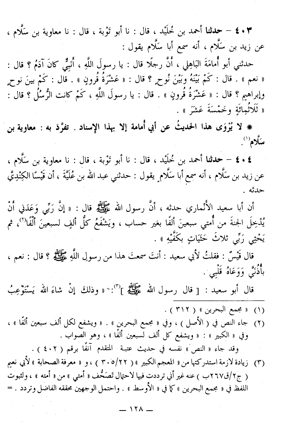 404 - حَدَّثَنَا أَحْمَدُ بْنُ خُلَيْدٍ قَالَ: نا أَبُو تَوْبَةَ قَالَ: نا مُعَاوِيَةُ بْنُ سَلَّامٍ، عَنْ زَيْدِ بْنِ سَلَّامٍ، أَنَّهُ سَمِعَ أَبَا سَلَّامٍ، يَقُولُ: حَدَّثَنِي عَبْدُ اللَّهِ بْنُ عُلَيَّةَ، أَنَّ قَيْسًا الْكِنْدِيَّ، حَدَّثَهُ. أَنَّ أَبَا سَعِيدٍ الْأَنْمَارِيَّ حَدَّثَهُ، أَنَّ رَسُولَ اللَّهِ صَلَّى اللهُ عَلَيْهِ وَسَلَّمَ قَالَ: «إِنَّ §رَبِّي وَعَدَنِي أَنْ يُدْخَلَ الْجَنَّةَ مِنْ أُمَّتِي سَبْعِينَ أَلْفًا بِغَيْرِ حِسَابٍ، وَيَشْفَعُ كُلُّ أَلْفٍ لِسَبْعِينَ أَلْفًا، ثُمَّ يَحْثِي رَبِّي ثَلَاثَ حَثَيَاتٍ بِكَفَّيْهِ» . قَالَ قَيْسٌ: فَقُلْتُ لِأَبِي سَعِيدٍ: أَنْتَ سَمِعْتَ هَذَا مِنْ رَسُولِ اللَّهِ صَلَّى اللهُ عَلَيْهِ وَسَلَّمَ؟ قَالَ: نَعَمْ، بِأُذُنِي وَوَعَاهُ قَلْبِي. قَالَ أَبُو سَعِيدٍ: قَالَ رَسُولُ اللَّهِ صَلَّى اللهُ عَلَيْهِ وَسَلَّمَ: «وَذَلِكَ إِنْ شَاءَ اللَّهُ يَسْتَوْعِبُ -[129]- مُهَاجِرِي أُمَّتِي، ويُوَفِّيَ اللَّهُ عَزَّ وَجَلَّ بَقِيَّتَهُ مِنْ أَعْرَابِنَا» . لَا يُرْوَى هَذَا الْحَدِيثُ عَنْ أَبِي سَعِيدٍ الْأَنْمَارِيِّ إِلَّا بِهَذَا الْإِسْنَادِ، تَفَرَّدَ بِهِ: مُعَاوِيَةُ بْنُ سَلَّامٍ