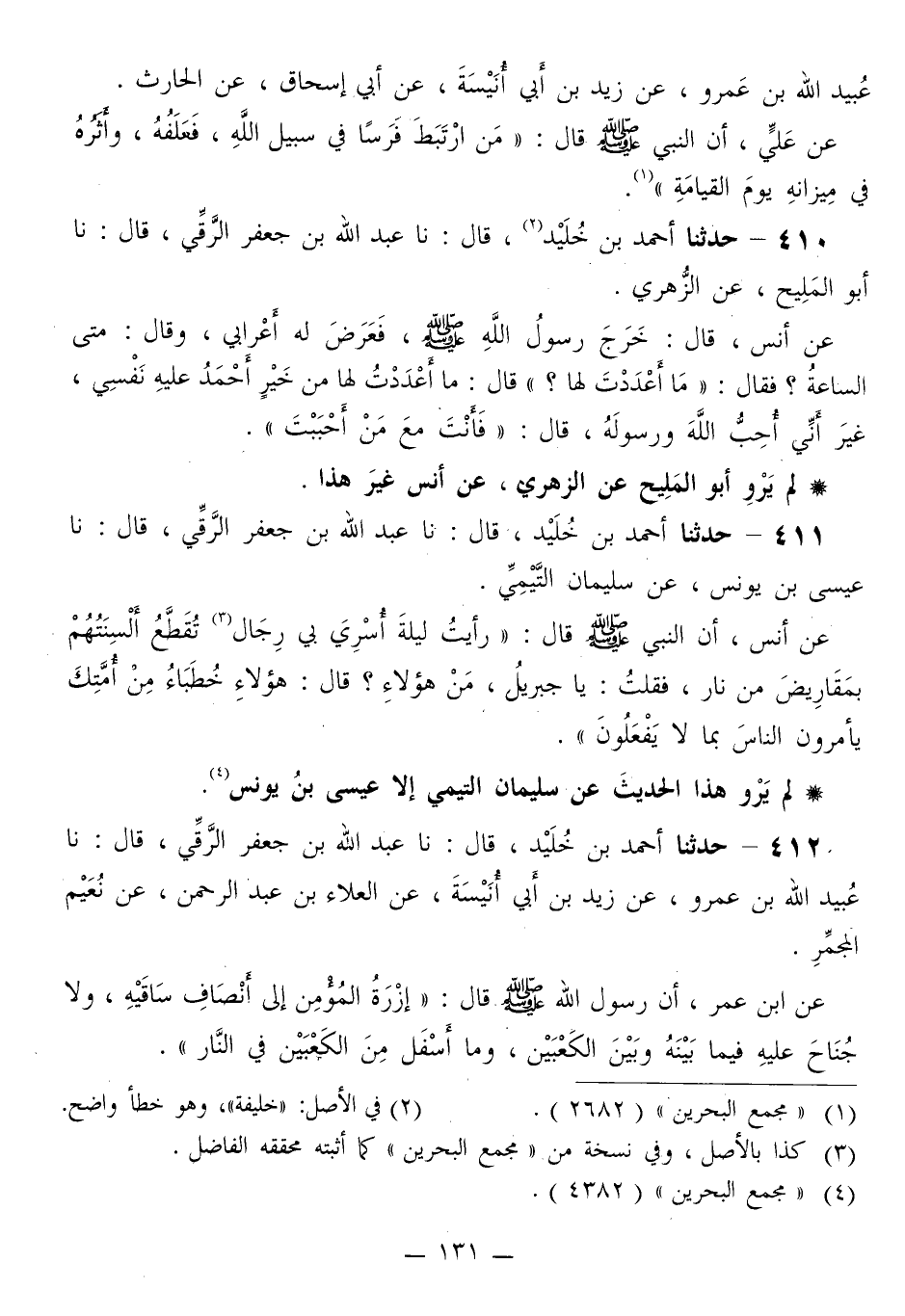 412 - حَدَّثَنَا أَحْمَدُ بْنُ خُلَيْدٍ قَالَ: نا عَبْدُ اللَّهِ بْنُ جَعْفَرٍ الرَّقِّيُّ قَالَ: نا عُبَيْدُ اللَّهِ بْنُ عَمْرٍو، عَنْ زَيْدِ بْنِ أَبِي أُنَيْسَةَ، عَنِ الْعَلَاءِ بْنِ عَبْدِ الرَّحْمَنِ، عَنْ نُعَيْمٍ الْمُجَمِّرِ، عَنِ ابْنِ عُمَرَ، أَنَّ رَسُولَ اللَّهِ صَلَّى اللهُ عَلَيْهِ وَسَلَّمَ قَالَ: «§إِزْرَةُ الْمُؤْمِنِ إِلَى أَنْصَافِ سَاقَيْهِ، وَلَا جُنَاحٌ عَلَيْهِ فِيمَا بَيْنَهُ وَبَيْنَ الْكَعْبَيْنِ، وَمَا أَسْفَلَ مِنَ الْكَعْبَيْنِ فِي النَّارِ» -[132]- لَمْ يَرْوِ هَذَا الْحَدِيثَ عَنْ نُعَيْمٍ الْمُجَمِّرِ إِلَّا الْعَلَاءُ بْنُ عَبْدِ الرَّحْمَنِ، تَفَرَّدَ بِهِ: زَيْدُ بْنُ أَبِي أُنَيْسَةَ