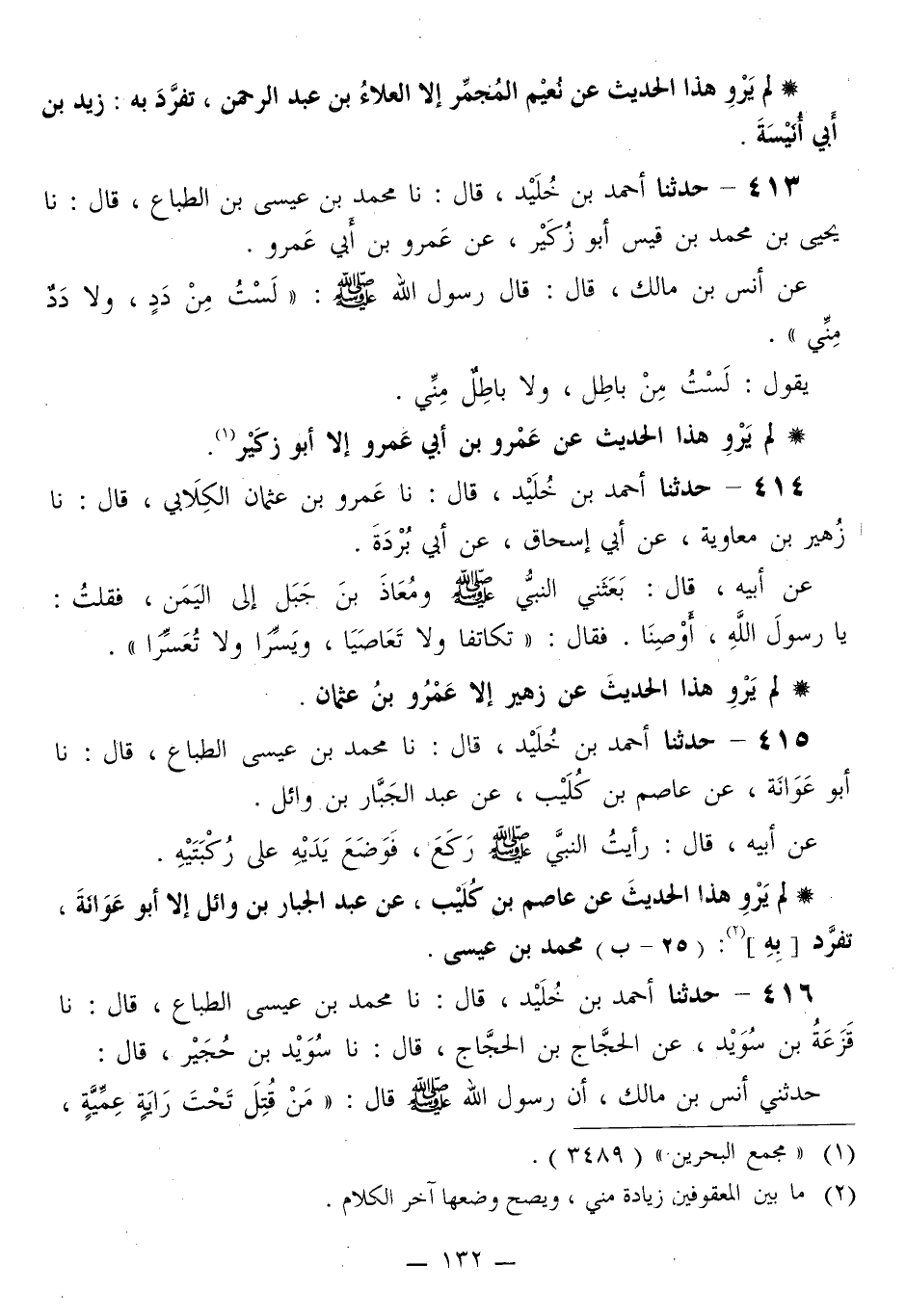 413 - حَدَّثَنَا أَحْمَدُ بْنُ خُلَيْدٍ قَالَ: نا مُحَمَّدُ بْنُ عِيسَى بْنِ الطَّبَّاعِ قَالَ: نا يَحْيَى بْنُ مُحَمَّدِ بْنِ قَيْسٍ أَبُو زُكَيْرٍ، عَنْ عَمْرِو بْنِ أَبِي عَمْرٍو، عَنْ أَنَسِ بْنِ مَالِكٍ قَالَ: قَالَ رَسُولُ اللَّهِ صَلَّى اللهُ عَلَيْهِ وَسَلَّمَ: «§لَسْتُ مِنْ دَدٍ، وَلَا دَدٍ مِنِّي» . يَقُولُ: لَسْتُ مِنْ بَاطِلٍ، وَلَا بَاطِلٌ مِنِّي. لَمْ يَرْوِ هَذَا الْحَدِيثَ عَنْ عَمْرِو بْنِ أَبِي عَمْرٍو إِلَّا أَبُو زُكَيْرٍ
