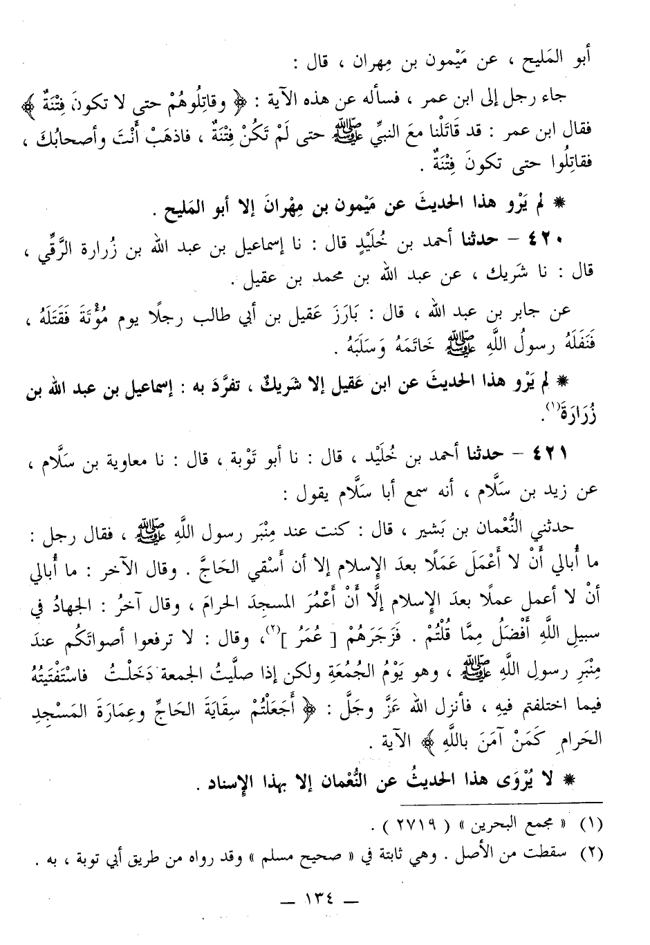 421 - حَدَّثَنَا أَحْمَدُ بْنُ خُلَيْدٍ قَالَ: نا أَبُو تَوْبَةَ قَالَ: نا مُعَاوِيَةُ بْنُ سَلَّامٍ، عَنْ زَيْدِ بْنِ سَلَّامٍ، أَنَّهُ سَمِعَ أَبَا سَلَّامٍ، يَقُولُ: حَدَّثَنِي النُّعْمَانُ بْنُ بَشِيرٍ قَالَ: كُنْتُ عِنْدَ مِنْبَرِ رَسُولِ اللَّهِ صَلَّى اللهُ عَلَيْهِ وَسَلَّمَ فَقَالَ رَجُلٌ: مَا أُبَالِي أَنْ لَا أَعْمَلَ عَمَلًا بَعْدَ الْإِسْلَامِ إِلَّا أَنْ أَسْقِيَ الْحَاجَّ. وَقَالَ الْآخَرُ: مَا أُبَالِي أَنْ لَا أَعْمَلَ عَمَلًا بَعْدَ الْإِسْلَامِ إِلَّا أَنْ أَعْمُرَ الْمَسْجِدَ الْحَرَامَ، وَقَالَ آخَرُ: الْجِهَادُ فِي سَبِيلِ اللَّهِ أَفْضَلُ مِمَّا قُلْتُمْ. فَزَجَرَهُمْ عُمَرُ، وَقَالَ: «§لَا تَرْفَعُوا أَصْوَاتَكُمْ عِنْدَ مِنْبَرِ رَسُولِ اللَّهِ صَلَّى اللهُ عَلَيْهِ وَسَلَّمَ، وَهُوَ يَوْمُ الْجُمُعَةِ وَلَكِنْ إِذَا صَلَّيْتَ الْجُمُعَةَ دَخَلْتُ فَاسْتَفْتَيْتُهُ فِيمَا اخْتَلَفْتُمْ فِيهِ» ، فَأَنْزَلَ اللَّهُ عَزَّ وَجَلَّ: {أَجَعَلْتُمْ سِقَايَةَ الْحَاجِّ وَعِمَارَةَ الْمَسْجِدِ الْحَرَامِ كَمَنْ آمَنَ بِاللَّهِ} [التوبة: 19] الْآيَةَ. لَا يُرْوَى هَذَا الْحَدِيثُ عَنِ النُّعْمَانِ إِلَّا بِهَذَا الْإِسْنَادِ