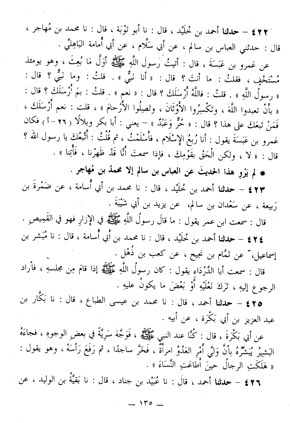 425 - حَدَّثَنَا أَحْمَدُ قَالَ: نا مُحَمَّدُ بْنُ عِيسَى الطَّبَّاعُ قَالَ: نا بَكَّارُ بْنُ عَبْدِ الْعَزِيزِ بْنِ أَبِي بَكَرَةَ، عَنْ أَبِيهِ، عَنْ أَبِي بَكَرَةَ قَالَ: كُنَّا عِنْدَ النَّبِيِّ صَلَّى اللهُ عَلَيْهِ وَسَلَّمَ فَوَجَّهَ سَرِيَّةً فِي بَعْضِ الْوُجُوهِ، فَجَاءَهُ الْبَشِيرُ يُبَشِّرُهُ، بِأَنَّ وَلِيَ أَمْرِ الْعَدُوِّ امْرَأَةٌ، فَخَرَّ سَاجِدًا، ثُمَّ رَفَعَ رَأْسَهُ، وَهُوَ يَقُولُ: «§هَلَكَتِ الرِّجَالُ حِينَ أَطَاعَتِ النِّسَاءَ»