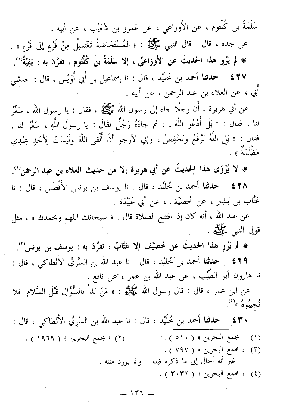 429 - حَدَّثَنَا أَحْمَدُ بْنُ خُلَيْدٍ قَالَ: نا عَبْدُ اللَّهِ بْنُ السَّرِيِّ الْأَنْطَاكِيُّ قَالَ: نا هَارُونُ أَبُو الطِّيبِ، عَنْ عَبْدِ اللَّهِ بْنِ عُمَرَ، عَنْ نَافِعٍ، عَنِ ابْنِ عُمَرَ قَالَ: قَالَ رَسُولُ اللَّهِ صَلَّى اللهُ عَلَيْهِ وَسَلَّمَ: «§مَنْ بَدَأَ بِالسُّؤَالِ قَبْلَ السَّلَامِ فَلَا تُجِيبُوهُ»