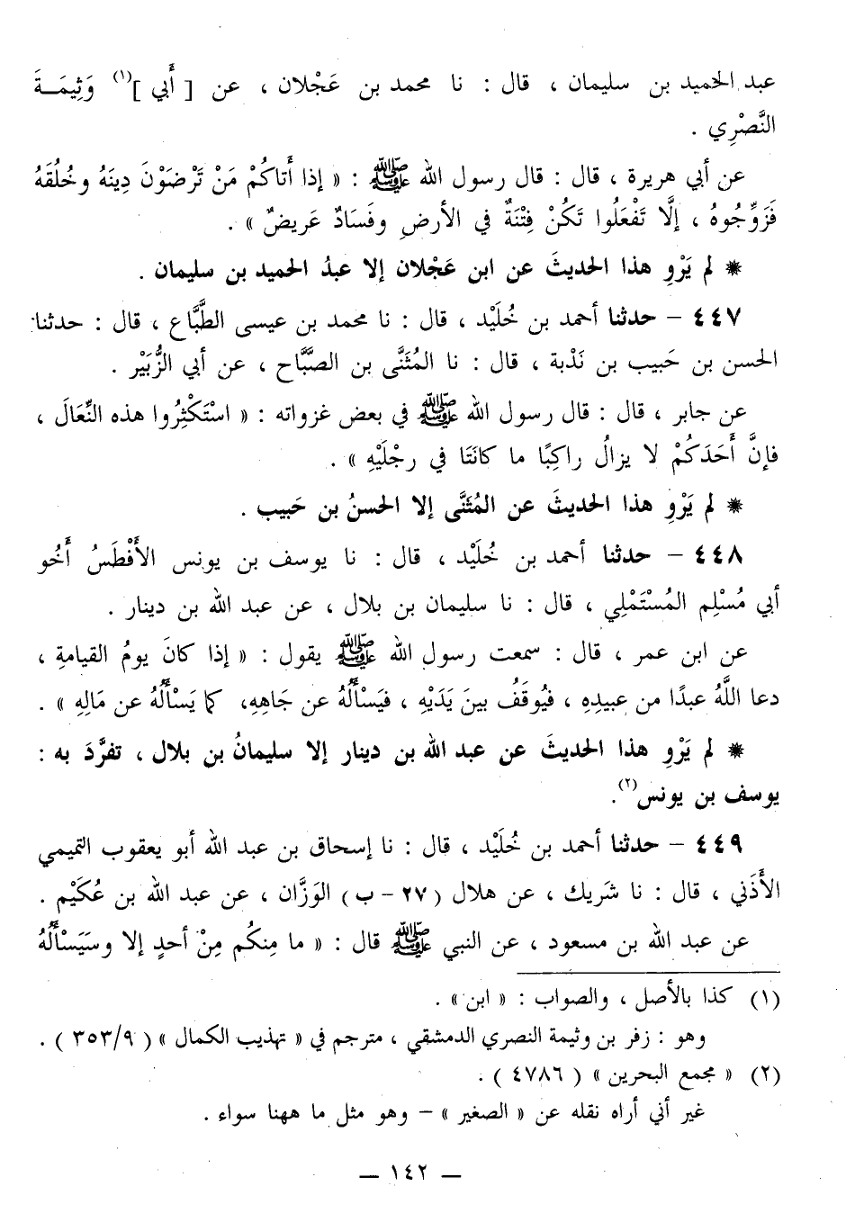 448 - حَدَّثَنَا أَحْمَدُ بْنُ خُلَيْدٍ قَالَ: نا يُوسُفُ بْنُ يُونُسَ الْأَفْطَسُ، أَخُو أَبِي مُسْلِمٍ الْمُسْتَمْلِي قَالَ: نا سُلَيْمَانُ بْنُ بِلَالٍ، عَنْ عَبْدِ اللَّهِ بْنِ دِينَارٍ، عَنِ ابْنِ عُمَرَ قَالَ: سَمِعْتُ رَسُولَ اللَّهِ صَلَّى اللهُ عَلَيْهِ وَسَلَّمَ يَقُولُ: «§إِذَا كَانَ يَوْمُ الْقِيَامَةِ، دَعَا اللَّهُ عَبْدًا مِنْ عَبِيدِهِ، فَيُوقَفُ بَيْنَ يَدَيْهِ، فَيَسْأَلُهُ عَنْ جَاهِهِ، كَمَا يَسْأَلُهُ عَنْ مَالِهِ»