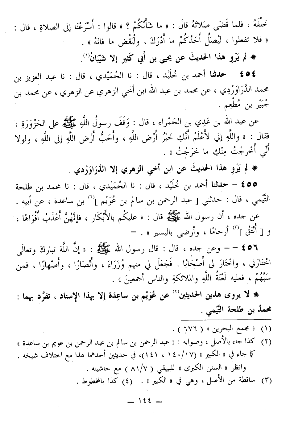 454 - حَدَّثَنَا أَحْمَدُ بْنُ خُلَيْدٍ قَالَ: نا الْحُمَيْدِيُّ قَالَ: نا عَبْدُ الْعَزِيزِ بْنُ مُحَمَّدٍ الدَّرَاوَرْدِيُّ، عَنْ مُحَمَّدِ بْنِ عَبْدِ اللَّهِ ابْنِ أَخِي الزُّهْرِيِّ، عَنِ الزُّهْرِيِّ، عَنْ مُحَمَّدِ بْنِ جُبَيْرِ بْنِ مُطْعِمٍ، عَنْ عَبْدِ اللَّهِ بْنِ عَدِيِّ بْنِ الْحَمْرَاءِ قَالَ: وَقَفَ رَسُولُ اللَّهِ صَلَّى اللهُ عَلَيْهِ وَسَلَّمَ عَلَى الْحَزْوَرَةِ، فَقَالَ: «وَاللَّهِ إِنِّي §لَأَعْلَمُ أَنَّكِ خَيْرُ أَرْضِ اللَّهِ، وَأَحَبُّ أَرْضِ اللَّهِ إِلَى اللَّهِ، وَلَوْلَا أَنِّي أُخْرِجْتُ مِنْكِ مَا خَرَجْتُ»