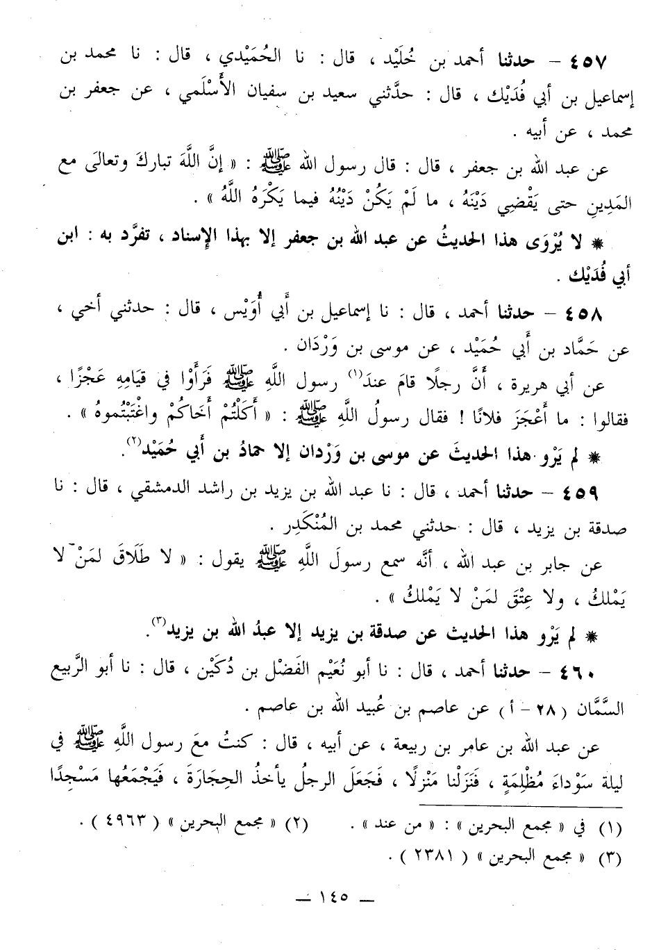 457 - حَدَّثَنَا أَحْمَدُ بْنُ خُلَيْدٍ قَالَ: نا الْحُمَيْدِيُّ قَالَ: نا مُحَمَّدُ بْنُ إِسْمَاعِيلَ بْنِ أَبِي فُدَيْكٍ قَالَ: حَدَّثَنِي سَعِيدُ بْنُ سُفْيَانَ الْأَسْلَمِيُّ، عَنْ جَعْفَرِ بْنِ مُحَمَّدٍ، عَنْ أَبِيهِ، عَنْ عَبْدِ اللَّهِ بْنِ جَعْفَرٍ قَالَ: قَالَ رَسُولُ اللَّهِ صَلَّى اللهُ عَلَيْهِ وَسَلَّمَ: «إِنَّ §اللَّهَ تَبَارَكَ وَتَعَالَى مَعَ الْمَدِينِ حَتَّى يَقْضِيَ دِينَهُ، مَا لَمْ يَكُنْ دِينُهُ فِيمَا يَكْرَهُ اللَّهُ»