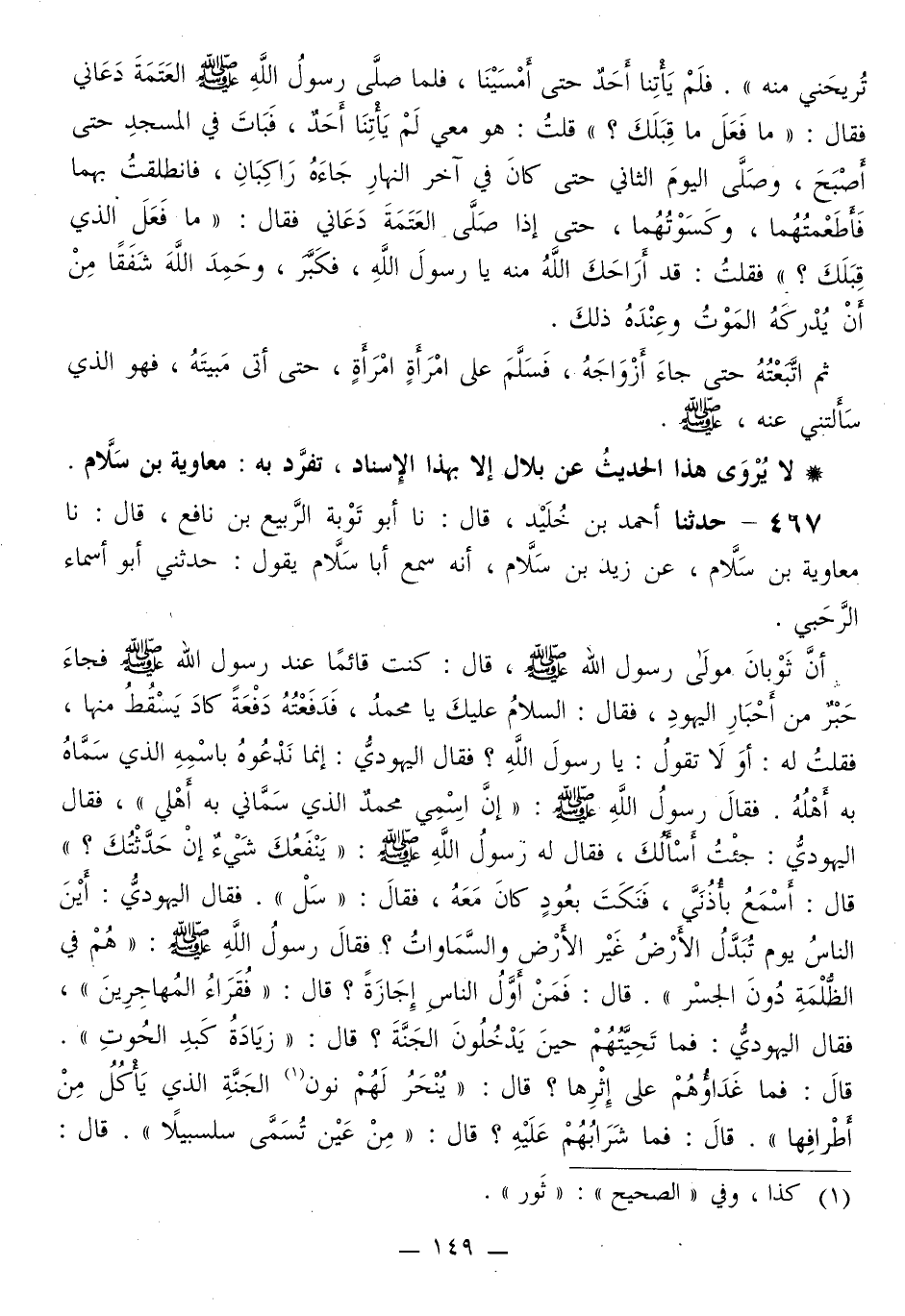 467 - حَدَّثَنَا أَحْمَدُ بْنُ خُلَيْدٍ قَالَ: نا أَبُو تَوْبَةَ الرَّبِيعُ بْنُ نَافِعٍ قَالَ: نا مُعَاوِيَةُ بْنُ سَلَّامٍ، عَنْ زيد بْنِ سَلَّامٍ، أَنَّهُ سَمِعَ أَبَا سَلَّامٍ، يَقُولُ: حَدَّثَنِي أَبُو أَسْمَاءَ الرَّحَبِيُّ، أَنَّ ثَوْبَانَ، مَوْلَى رَسُولِ اللَّهِ صَلَّى اللهُ عَلَيْهِ وَسَلَّمَ، قَالَ: كُنْتُ قَائِمًا عِنْدَ رَسُولِ اللَّهِ صَلَّى اللهُ عَلَيْهِ وَسَلَّمَ فَجَاءَ حَبْرٌ مِنْ أَحْبَارِ الْيَهُودِ، فَقَالَ: السَّلَامُ عَلَيْكَ يَا مُحَمَّدُ، فَدَفَعْتُهُ دَفْعَةً كَادَ يَسْقُطُ مِنْهَا، فَقُلْتُ لَهُ: أَوَلَا تَقُولُ: يَا رَسُولَ اللَّهِ؟ فَقَالَ الْيَهُودِيُّ: إِنَّمَا نَدْعُوهُ بِاسْمِهِ الَّذِي سَمَّاهُ بِهِ أَهْلُهُ. فَقَالَ رَسُولُ اللَّهِ صَلَّى اللهُ عَلَيْهِ وَسَلَّمَ: «إِنَّ §اسْمِي مُحَمَّدٌ الَّذِي سَمَّانِي بِهِ أَهْلِي» ، فَقَالَ الْيَهُودِيُّ: جِئْتُ أَسْأَلُكَ، فَقَالَ لَهُ رَسُولُ اللَّهِ صَلَّى اللهُ عَلَيْهِ وَسَلَّمَ: «يَنْفَعُكَ شَيْءٌ إِنْ حَدَّثْتُكَ؟» قَالَ: أَسْمَعُ بِأُذُنِي، فَنَكَتَ بِعُودٍ كَانَ مَعَهُ، فَقَالَ: «سَلْ» . فَقَالَ الْيَهُودِيُّ: أَيْنَ النَّاسُ يَوْمَ تُبَدَّلُ الْأَرْضُ غَيْرَ الْأَرْضِ وَالسَّمَاوَاتُ؟ فَقَالَ رَسُولُ اللَّهِ صَلَّى اللهُ عَلَيْهِ وَسَلَّمَ: «هُمْ فِي الظُّلْمَةِ دُونَ الْجَسْرِ» . قَالَ: فَمَنْ أَوَّلُ النَّاسِ إِجَازَةً؟ قَالَ: «فُقَرَاءُ الْمُهَاجِرِينَ» ، فَقَالَ الْيَهُودِيُّ: فَمَا تَحِيَّتُهُمْ حِينَ يَدْخُلُونَ الْجَنَّةَ؟ قَالَ: «زِيَادَةُ كَبِدِ الْحُوتِ» . قَالَ: فَمَا غَدَاؤُهُمْ عَلَى إِثْرِهَا؟ قَالَ: «يُنْحَرُ لَهُمْ ثَوْرُ الْجَنَّةِ الَّذِي يَأْكُلُ مِنْ أَطْرَافِهَا» . قَالَ: فَمَا شَرَابُهُمْ عَلَيْهِ؟ قَالَ: «مِنْ عَيْنٍ تُسَمَّى سَلْسَبِيلًا» . قَالَ: -[150]- صَدَقْتَ. قَالَ: وَجِئْتُ أَسْأَلُكَ عَنْ شَيْءٍ لَا يَعْلَمُهُ أَحَدٌ مِنْ أَهْلِ الْأَرْضِ، إِلَّا نَبِيٌّ، أَوْ رَجُلٌ، أَوْ رَجُلَانِ. قَالَ: «يَنْفَعُكَ إِنْ حَدَّثْتُكَ؟» قَالَ: أَسْمَعُ بِأُذُنِي. قَالَ: جِئْتُ أَسْأَلُكَ عَنِ الْوَلَدِ. فَقَالَ: «مَاءُ الرَّجُلِ أَبْيَضُ، وَمَاءُ الْمَرْأَةِ أَصْفَرُ، فَإِذَا اجْتَمَعَا فَعَلَا مَنِيُّ الرَّجُلِ مَنِيَّ الْمَرْأَةِ، أَذْكَرَا بِإِذْنِ اللَّهِ، وَإِذَا عَلَا مَنِيُّ الْمَرْأَةِ مَنِيَّ الرَّجُلِ، آنَثَا بِإِذْنِ اللَّهِ» . فَقَالَ الْيَهُودِيُّ: لَقَدْ صَدَقْتَ، وَإِنَّكَ نَبِيٌّ، ثُمَّ انْصَرَفَ، فَذَهَبَ. فَقَالَ رَسُولُ اللَّهِ صَلَّى اللهُ عَلَيْهِ وَسَلَّمَ: «لَقَدْ سَأَلَنِي عَمَّا سَأَلَنِي عَنْهُ، وَمَا لِي عِلْمٌ بِشَيْءٍ مِنْهُ، حَتَّى أَتَانِي اللَّهُ بِهِ»