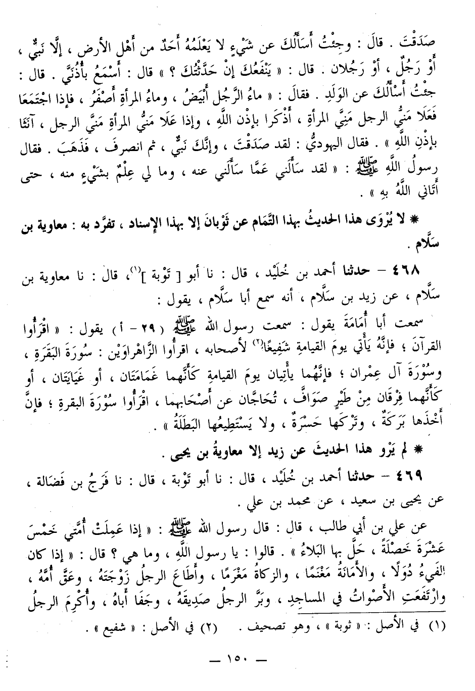 468 - حَدَّثَنَا أَحْمَدُ بْنُ خُلَيْدٍ قَالَ: نا أَبُو تَوْبَةَ قَالَ: نا مُعَاوِيَةُ بْنُ سَلَّامٍ، عَنْ زَيْدِ بْنِ سَلَّامٍ، أَنَّهُ سَمِعَ أَبَا سَلَّامٍ، يَقُولُ: سَمِعْتُ أَبَا أُمَامَةَ، يَقُولُ: سَمِعْتُ رَسُولَ اللَّهِ صَلَّى اللهُ عَلَيْهِ وَسَلَّمَ يَقُولُ: «§اقْرَأُوا الْقُرْآنَ، فَإِنَّهُ يَأْتِي يَوْمَ الْقِيَامَةِ شَفِيعًا لِأَصْحَابِهِ، اقْرَأُوا الزَّهْرَاوَيْنِ: سُورَةَ الْبَقَرَةِ، وَسُورَةَ آلِ عِمْرَانَ؛ فَإِنَّهُمَا يَأْتِيَانِ يَوْمَ الْقِيَامَةِ كَأَنَّهُمَا غَمَامَتَانِ، أَوْ غَيَايَتَانِ، أَوْ كَأَنَّهُمَا فِرْقَانِ مِنْ طَيْرٍ صَوَافَّ، تُحَاجَّانِ عَنْ أَصْحَابِهِمَا، اقْرَأُوا سُورَةَ الْبَقَرَةِ؛ فَإِنَّ أَخْذَهَا بَرَكَةٌ، وَتَرْكَهَا حَسْرَةٌ، وَلَا يَسْتَطِيعُهَا الْبَطَلَةُ»