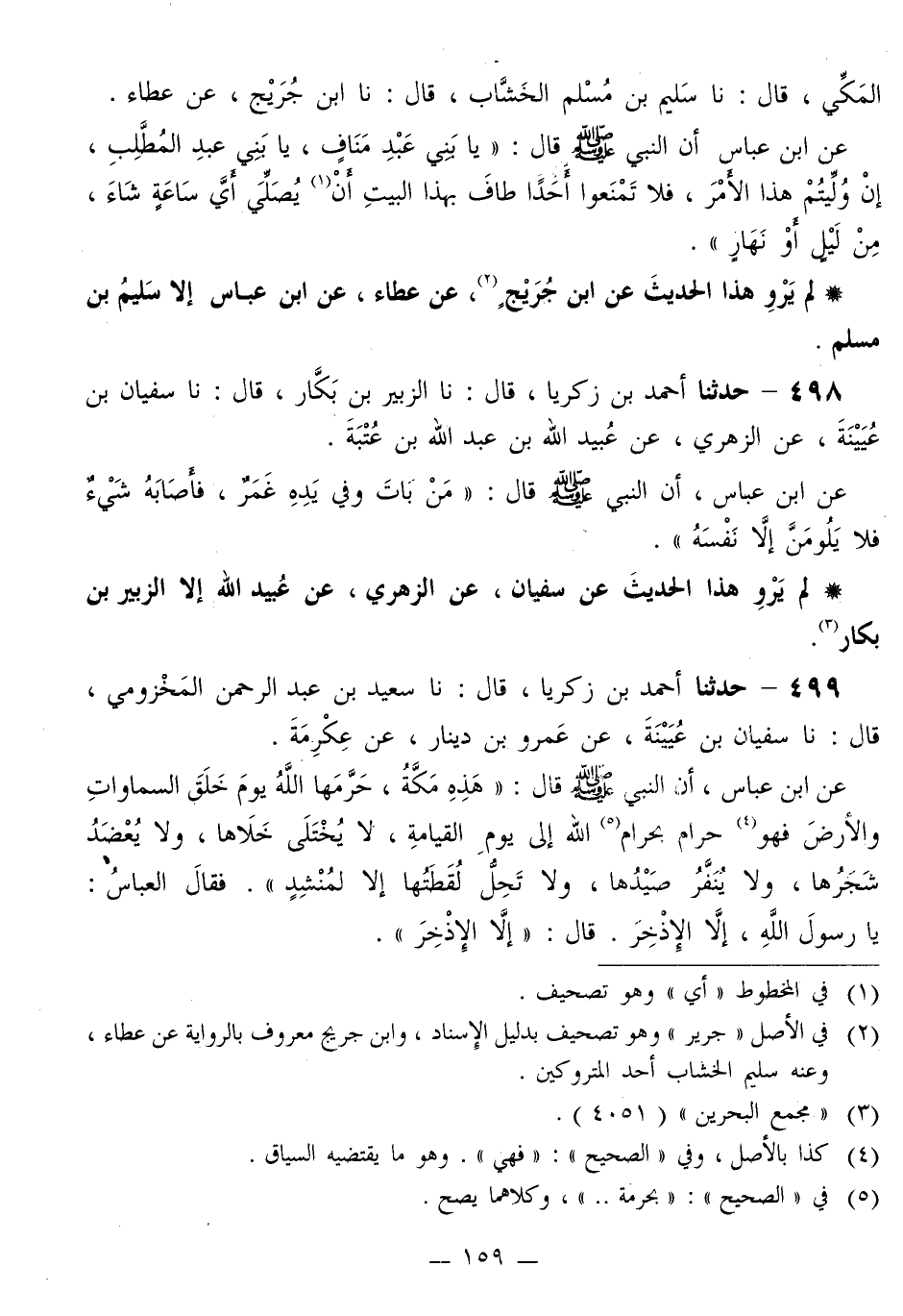 حَدَّثَنَا أَحْمَدُ بْنُ زَكَرِيَّا قَالَ: نا سَعِيدُ بْنُ عَبْدِ الرَّحْمَنِ الْمَخْزُومِيُّ قَالَ: نا سُفْيَانُ بْنُ عُيَيْنَةَ، عَنْ عَمْرِو بْنِ دِينَارٍ، عَنْ عِكْرِمَةَ، عَنِ ابْنِ عَبَّاسٍ، أَنَّ النَّبِيَّ صَلَّى اللهُ عَلَيْهِ وَسَلَّمَ قَالَ: «§هَذِهِ مَكَّةُ، حَرَّمَهَا اللَّهُ يَوْمَ خَلَقَ السَّمَاوَاتِ وَالْأَرْضَ فَهُوَ حَرَامٌ بِحَرَامِ اللَّهِ إِلَى يَوْمِ الْقِيَامَةِ، لَا يُخْتَلَى خَلَاهَا، وَلَا يُعْضَدُ شَجَرُهَا، وَلَا يُنَفَّرُ صَيْدُهَا، وَلَا تَحِلُّ لُقَطَتُهَا إِلَّا لِمُنْشِدٍ» فَقَالَ الْعَبَّاسُ: يَا رَسُولَ اللَّهِ، إِلَّا الْإِذْخِرَ. قَالَ: «إِلَّا الْإِذْخِرَ» -[160]- لَمْ يَرْوِهِ عَنْ سُفْيَانَ إِلَّا سَعِيدُ بْنُ عَبْدِ الرَّحْمَنِ