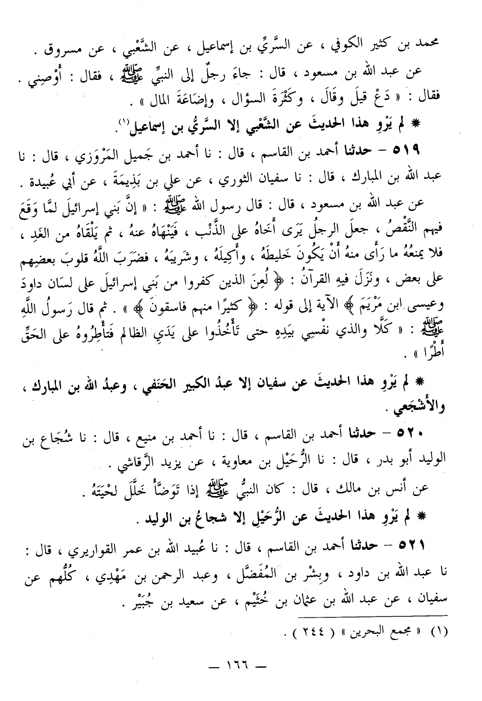 519 - حَدَّثَنَا أَحْمَدُ بْنُ الْقَاسِمِ قَالَ: نا أَحْمَدُ بْنُ جَمِيلٍ الْمَرْوَزِيُّ قَالَ: نا عَبْدُ اللَّهِ بْنُ الْمُبَارَكِ قَالَ: نا سُفْيَانُ الثَّوْرِيُّ، عَنْ عَلِيِّ بْنِ بَذِيمَةَ، عَنْ أَبِي عُبَيْدَةَ، عَنْ عَبْدِ اللَّهِ بْنِ مَسْعُودٍ قَالَ: قَالَ رَسُولُ اللَّهِ صَلَّى اللهُ عَلَيْهِ وَسَلَّمَ: «إِنَّ §بَنِي إِسْرَائِيلَ لَمَّا وَقَعَ فِيهِمُ النَّقْصُ، جَعَلَ الرَّجُلُ يَرَى أَخَاهُ عَلَى الذَّنْبِ، فَيَنْهَاهُ عَنْهُ، ثُمَّ يَلْقَاهُ مِنَ الْغَدِ، فَلَا يَمْنَعُهُ مَا رَأَى مِنْهُ أَنْ يَكُونَ خَلِيطَهُ، وَأَكِيلَهُ، وَشَرِيبَهُ، فَضَرَبَ اللَّهُ قُلُوبَ بَعْضِهِمْ عَلَى بَعْضٍ، وَنَزَلَ فِيهِ الْقُرْآنُ: {لُعِنَ الَّذِينَ كَفَرُوا مِنْ بَنِي إِسْرَائِيلَ عَلَى لِسَانِ دَاوُدَ وَعِيسَى ابْنِ مَرْيَمَ} الْآيَةَ، إِلَى قَوْلِهِ: {كَثِيرًا مِنْهُمْ فَاسِقُونَ} [المائدة: 81] » . ثُمَّ قَالَ رَسُولُ اللَّهِ صَلَّى اللهُ عَلَيْهِ وَسَلَّمَ: «كَلَّا وَالَّذِي نَفْسِي بِيَدِهِ حَتَّى تَأْخُذُوا عَلَى يَدَيِ الظَّالِمِ فَتَأْطُرُوهُ عَلَى الْحَقِّ أَطْرًا»