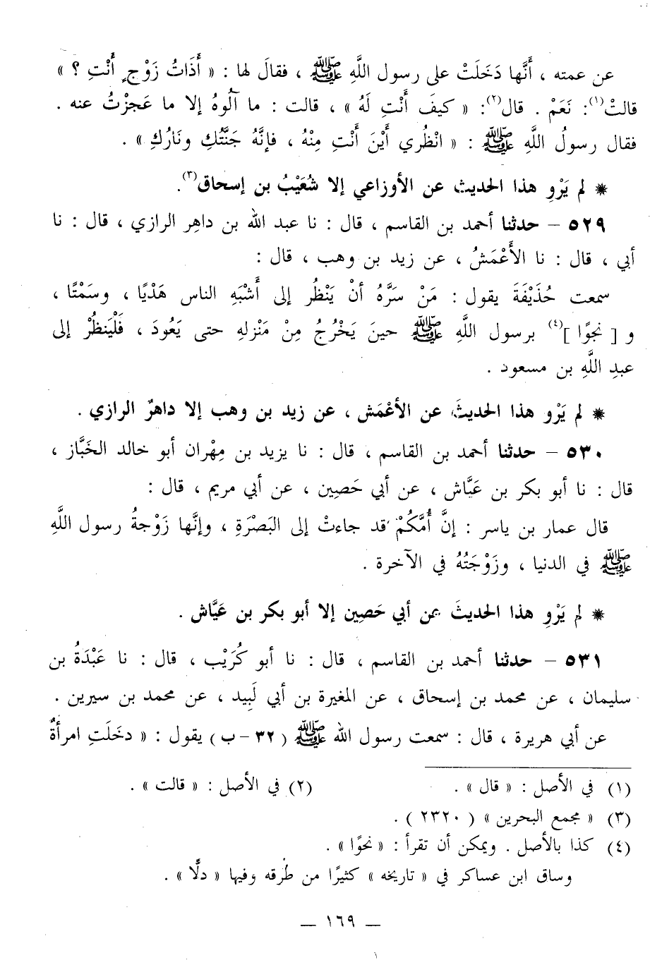 529 - حَدَّثَنَا أَحْمَدُ بْنُ الْقَاسِمِ قَالَ: نا عَبْدُ اللَّهِ بْنُ دَاهِرٍ الرَّازِيُّ قَالَ: نا أَبِي قَالَ: نا الْأَعْمَشُ، عَنْ زَيْدِ بْنِ وَهْبٍ قَالَ: سَمِعْتُ حُذَيْفَةَ يَقُولُ: «§مَنْ سَرَّهُ أَنْ يَنْظُرَ، إِلَى أَشْبَهِ النَّاسِ هَدْيًا وَسَمْتًا، وَنَجْوًا بِرَسُولِ اللَّهِ صَلَّى اللهُ عَلَيْهِ وَسَلَّمَ حِينَ يَخْرُجُ مِنْ مَنْزِلِهِ حَتَّى يَعُودَ، فَلْيَنْظُرْ إِلَى عَبْدِ اللَّهِ بْنِ مَسْعُودٍ»