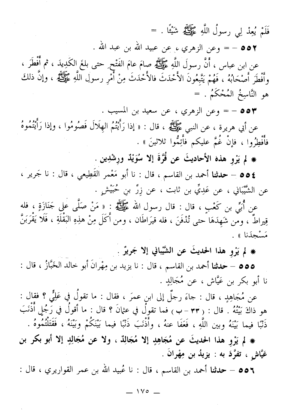 552 - وَعَنِ الزُّهْرِيِّ، عَنْ عُبَيْدِ اللَّهِ بْنِ عَبْدِ اللَّهِ، عَنِ ابْنِ عَبَّاسٍ، أَنَّ رَسُولَ اللَّهِ صَلَّى اللهُ عَلَيْهِ وَسَلَّمَ «§صَامَ عَامَ الْفَتْحِ حَتَّى بَلَغَ الْكَدِيدَ، ثُمَّ أَفْطَرَ، وَأَفْطَرَ أَصْحَابُهُ، فَهُمْ يَتَّبِعُونَ الْأَحْدَثَ فَالْأَحْدَثَ مِنْ أَمْرِ رَسُولِ اللَّهِ صَلَّى اللهُ عَلَيْهِ وَسَلَّمَ، وَإِنَّ ذَلِكَ هُوَ النَّاسِخُ الْمُحْكَمُ»