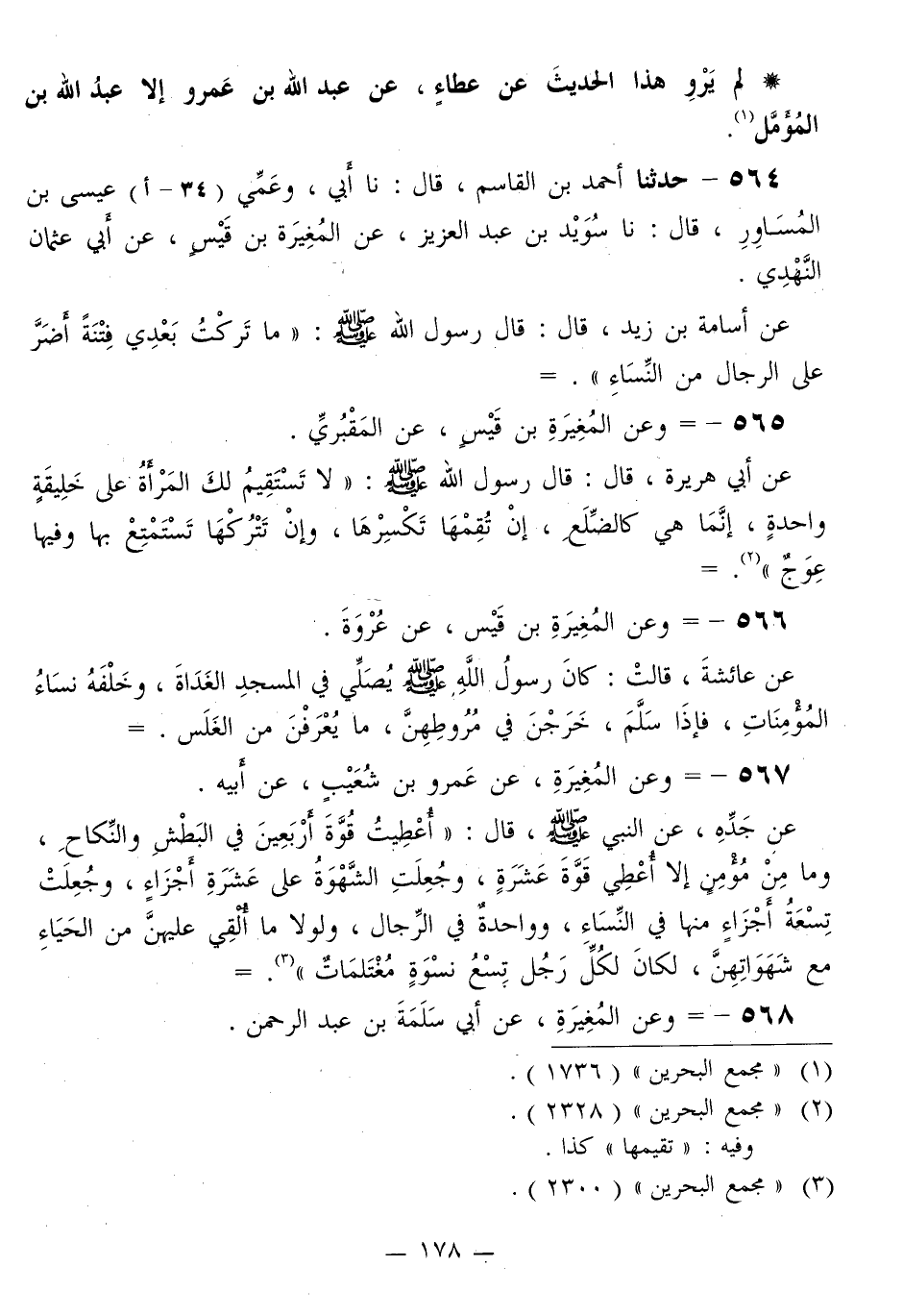 567 - وَعَنِ الْمُغِيرَةِ، عَنْ عَمْرِو بْنِ شُعَيْبٍ، عَنْ أَبِيهِ، عَنْ جَدِّهِ، عَنِ النَّبِيِّ صَلَّى اللهُ عَلَيْهِ وَسَلَّمَ قَالَ: «§أُعْطِيتُ قُوَّةَ أَرْبَعِينَ فِي الْبَطْشِ وَالنِّكَاحِ، وَمَا مِنْ مُؤْمِنٍ إِلَّا أُعْطِيَ قُوَّةَ عَشَرَةٍ، وَجُعِلَتِ الشَّهْوَةُ عَلَى عَشَرَةِ أَجْزَاءٍ، وَجُعِلَتْ تِسْعَةُ أَجْزَاءٍ مِنْهَا فِي النِّسَاءِ، وَوَاحِدَةٌ فِي الرِّجَالِ، وَلَوْلَا مَا أُلْقِيَ عَلَيْهِنَّ مِنَ الْحَيَاءِ مَعَ شَهَوَاتِهِنَّ، لَكَانَ لِكُلِّ رَجُلٍ تِسْعُ نِسْوَةٍ مُغْتَلَمَاتٍ»