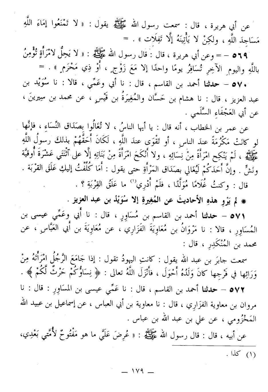570 - حَدَّثَنَا أَحْمَدُ بْنُ الْقَاسِمِ قَالَ: نا أَبِي، وَعَمِّي، قَالَا: نا سُوَيْدُ بْنُ عَبْدِ الْعَزِيزِ قَالَ: نا هِشَامُ بْنُ حَسَّانَ، وَالْمُغِيرَةُ بْنُ قَيْسٍ، عَنْ مُحَمَّدِ بْنِ سِيرِينَ، عَنْ أَبِي الْعَجْفَاءِ السَّلَمِيِّ، عَنْ عُمَرَ بْنِ الْخَطَّابِ، أَنَّهُ قَالَ: يَا أَيُّهَا النَّاسُ، «لَا تُغَالُوا بِصَدَاقِ النِّسَاءِ، فَإِنَّهَا لَوْ كَانَتْ مَكْرُمَةً عِنْدَ النَّاسِ، أَوْ تَقْوَى عِنْدَ اللَّهِ، لَكَانَ أَحَقُّهُمْ بِذَلِكَ رَسُولَ اللَّهِ صَلَّى اللهُ عَلَيْهِ وَسَلَّمَ،» §لَمْ يَنْكِحِ امْرَأَةً مِنْ نِسَائِهِ، وَلَا أَنْكَحَ امْرَأَةً مِنْ بَنَاتِهِ إِلَّا عَلَى اثْنَتَى عَشْرَةَ أُوقِيَّةً وَنَشٍّ. وَإِنَّ أَحَدَكُمْ لَيُغَالِي بِصَدَاقِ الْمَرْأَةِ حَتَّى يَقُولَ: أَمَا كُلِّفْتُ إِلَيْكِ عَلَقَ الْقِرْبَةِ قَالَ: وَكُنْتُ غُلَامًا مُوَلَّدًا، فَلَمْ أَدْرِي مَا عَلَقُ الْقِرْبَةِ؟ "