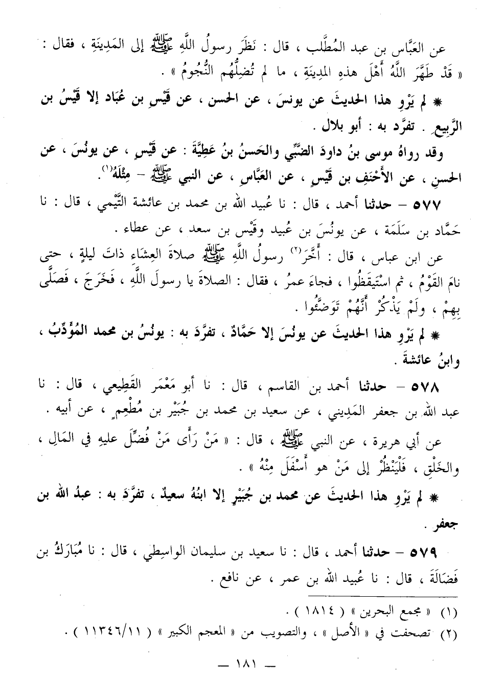 579 - حَدَّثَنَا أَحْمَدُ قَالَ: نا سَعِيدُ بْنُ سُلَيْمَانَ الْوَاسِطِيُّ قَالَ: نا مُبَارَكُ بْنُ فَضَالَةَ قَالَ: نا عُبَيْدُ اللَّهِ بْنُ عُمَرَ، عَنْ نَافِعٍ، -[182]- عَنِ ابْنِ عُمَرَ قَالَ: لَمَّا طَعَنَ أَبُو لُؤْلُؤَةَ عُمَرَ، طَعَنَهُ طَعْنَتَيْنِ، فَظَنَّ عُمَرُ أَنَّ لَهُ ذَنْبًا فِي النَّاسِ لَا يَعْلَمُهُ، فَدَعَا ابْنَ عَبَّاسٍ وَكَانَ يُحِبُّهُ، ويُدْنِيهِ، ويَسْتَمِعُ مِنْهُ، فَقَالَ لَهُ: أَحَبُّ أَنْ تَعْلَمَ عَنْ مَلَأٍ مِنَ النَّاسِ كَانَ هَذَا؟ فَخَرَجَ ابْنُ عَبَّاسٍ، فَجَعَلَ لَا يَمُرُّ بِمَلَإٍ مِنَ النَّاسِ إِلَّا وَهُمْ يَبْكُونَ، فَرَجَعَ إِلَيْهِ، فَقَالَ: يَا أَمِيرَ الْمُؤْمِنِينَ: مَا أَتَيْتُ عَلَى مَلَإٍ مِنَ الْمُسْلِمِينَ إِلَّا وَهُمْ يَبْكُونَ، كَأَنَّمَا فَقَدُوا الْيَوْمَ أبكارَ أَوْلَادِهِمْ. فَقَالَ: مَنْ قَتَلَنِي؟ قَالَ: أَبُو لُؤْلُؤَةَ الْمَجُوسِيُّ عَبْدُ الْمُغِيرَةِ بْنِ شُعْبَةَ. قَالَ ابْنُ عَبَّاسٍ: فَرَأَيْتُ الْبِشْرَ فِي وَجْهِهِ. فَقَالَ: «الْحَمْدُ لِلَّهِ الَّذِي لَمْ يَبْتَلِنِي بِقَوْلِ أَحَدٍ يُحَاجُّنِي بِقَوْلِ: لَا إِلَهَ إِلَّا اللَّهُ، أَمَا إِنِّي كُنْتُ قَدْ نَهَيْتُكُمْ أَنْ تَجْلِبُوا إِلَيْنَا مِنَ الْعُلُوجِ أَحَدًا، فَعَصَيتُمُونِي. ثُمَّ قَالَ: ادْعُوا لِي إِخْوَانِي» . قَالُوا: وَمَنْ؟ قَالَ: «عُثْمَانُ، وَعَلِيٌّ، وَطَلْحَةُ، وَالزُّبَيْرُ، وَعَبْدُ الرَّحْمَنِ بْنُ عَوْفٍ، وَسَعْدُ بْنُ أَبِي وَقَّاصٍ» . فَأَرْسَلَ إِلَيْهِمْ، ثُمَّ وَضَعَ رَأْسَهُ فِي حَجْرِي، فَلَمَّا جَاءُوا، قُلْتُ: هَؤُلَاءِ قَدْ حَضَرُوا. فَقَالَ: نَعَمْ، نَظَرْتُ فِي أَمْرِ الْمُسْلِمِينَ، فَوَجَدْتُكُمْ أَيُّهَا السِّتَّةُ رُءُوسَ النَّاسِ، وَقَادَتَهُمْ، وَلَا يَكُونُ هَذَا الْأَمْرُ إِلَّا فِيكُمْ مَا اسْتَقَمْتُمْ يَسْتَقِيمُ أَمْرُ النَّاسِ، وَإِنْ يَكُنِ اخْتِلَافٌ يَكُنْ فِيكُمْ، فَلَمَّا سَمِعْتُ ذِكْرَ الِاخْتِلَافِ، وَالشِّقَاقِ ظَنَنْتُ أَنَّهُ كَائِنٌ، لِأَنَّهُ قَلَّ مَا قَالَ شَيْئًا إِلَّا رَأَيْتُهُ، ثُمَّ نَزَفَ الدَّمَ، فَهَمَسُوا بَيْنَهُمْ حَتَّى خَشِيتُ أَنْ يُبَايِعُوا رَجُلًا مِنْهُمْ، فَقُلْتُ: إِنَّ أَمِيرَ الْمُؤْمِنِينَ حَيٌّ بَعْدُ، وَلَا يَكُونُ خَلِيفَتَانِ يَنْظُرُ أَحَدُهُمَا إِلَى الْآخَرِ. فَقَالَ: احْمِلُونِي، فَحَمَلْنَاهُ، فَقَالَ: تَشَاوِرُوا ثَلَاثًا. وَيُصَلِّي بِالنَّاسِ صُهَيْبٌ. قَالَ: مَنْ نُشَاوِرُ يَا أَمِيرَ الْمُؤْمِنِينَ؟ فَقَالَ: شَاوِرُوا الْمُهَاجِرِينَ وَالْأَنْصَارَ، وسَرَاةَ مَنْ هُنَا مِنَ الْأَجْنَادِ. ثُمَّ دَعَا بِشَرْبَةٍ مِنْ لَبَنٍ، فَشَرِبَ، فَخَرَجَ بَيَاضُ اللَّبَنِ مِنَ الْجُرْحَيْنِ، فَعُرِفَ أَنَّهُ الْمَوْتُ، فَقَالَ: الْآنَ لَوْ أَنَّ لِيَ الدُّنْيَا كُلَّهَا لَافْتَدَيْتُ بِهَا مِنْ هَوْلِ الْمَطْلَعِ، وَمَا ذَاكَ وَالْحَمْدُ لِلَّهِ إِنْ أَكُونُ رَأَيْتُ إِلَّا خَيْرًا. -[183]- فَقَالَ ابْنُ عَبَّاسٍ: وَإنْ قُلْتَ ذَلِكَ، فَجَزَاكَ اللَّهُ خَيْرًا، أَلَيْسَ قَدْ «§دَعَا رَسُولُ اللَّهِ صَلَّى اللهُ عَلَيْهِ وَسَلَّمَ أَنْ يُعِزَّ اللَّهُ بِكَ الدِّينَ وَالْمُسْلِمِينَ إِذْ يَخَافُونَ بِمَكَّةَ» ، فَلَمَّا أَسْلَمْتَ كَانَ إسْلَامُكَ عِزًّا، وَظَهَرَ بِكَ الْإِسْلَامُ وَرَسُولُ اللَّهِ صَلَّى اللهُ عَلَيْهِ وَسَلَّمَ وَأَصْحَابُهُ، وَهَاجَرْتَ إِلَى الْمَدِينَةِ، فَكَانَتْ هِجْرَتُكَ فَتْحًا، ثُمَّ لَمْ تَغِبْ عَنْ مَشْهَدٍ شَهِدَهُ رَسُولُ اللَّهِ صَلَّى اللهُ عَلَيْهِ وَسَلَّمَ مِنْ قِتَالِ الْمُشْرِكِينَ مِنْ يَوْمِ كَذَا وَيَوْمِ كَذَا، ثُمَّ قُبِضَ رَسُولُ اللَّهِ صَلَّى اللهُ عَلَيْهِ وَسَلَّمَ وَهُوَ عَنْكَ رَاضٍ، فَوَازَرْتَ الْخَلِ