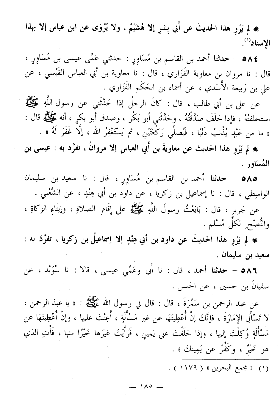 585 - حَدَّثَنَا أَحْمَدُ بْنُ الْقَاسِمِ بْنِ مُسَاوِرٍ قَالَ: نا سَعِيدُ بْنُ سُلَيْمَانَ الْوَاسِطِيُّ قَالَ: نا إِسْمَاعِيلُ بْنُ زَكَرِيَّا، عَنْ دَاوُدَ بْنِ أَبِي هِنْدٍ، عَنِ الشَّعْبِيِّ، عَنْ جَرِيرٍ قَالَ: «§بَايَعْتُ رَسُولَ اللَّهِ صَلَّى اللهُ عَلَيْهِ وَسَلَّمَ عَلَى إِقَامِ الصَّلَاةِ، وَإِيتَاءِ الزَّكَاةِ، وَالنُّصْحِ لِكُلِّ مُسْلِمٍ»