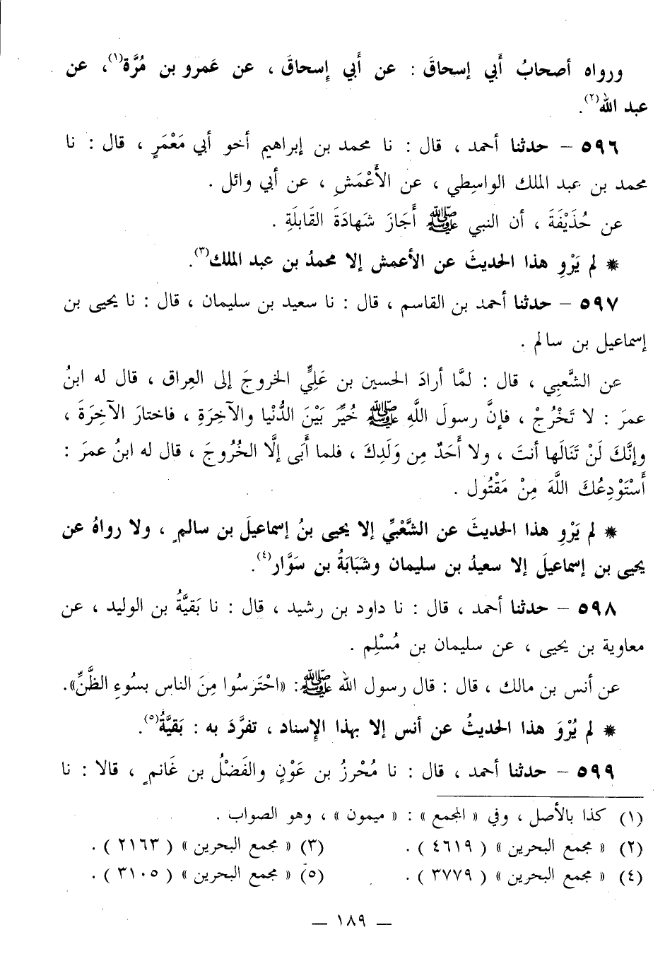 597 - حَدَّثَنَا أَحْمَدُ بْنُ الْقَاسِمِ قَالَ: نا سَعِيدُ بْنُ سُلَيْمَانَ قَالَ: نا يَحْيَى بْنُ إِسْمَاعِيلَ بْنِ سَالِمٍ، عَنِ الشَّعْبِيِّ قَالَ: لَمَّا أَرَادَ الْحُسَيْنُ بْنُ عَلِيٍّ الْخُرُوجَ إِلَى الْعِرَاقِ، قَالَ لَهُ ابْنُ عُمَرَ: لَا تَخْرُجْ، فَإِنَّ رَسُولَ اللَّهِ صَلَّى اللهُ عَلَيْهِ وَسَلَّمَ «§خُيِّرَ بَيْنَ الدُّنْيَا وَالْآخِرَةِ، فَاخْتَارَ الْآخِرَةَ» ، وَإِنَّكَ لَنْ تَنَالَهَا أَنْتَ، وَلَا أَحَدٌ مِنْ وَلَدِكَ، فَلَمَّا أَبَى إِلَّا الْخُرُوجَ، قَالَ لَهُ ابْنُ عُمَرَ: أَسْتَوْدِعُكَ اللَّهَ مِنْ مَقْتُولٍ لَمْ يَرْوِ هَذَا الْحَدِيثَ عَنِ الشَّعْبِيِّ إِلَّا يَحْيَى بْنُ إِسْمَاعِيلَ بْنِ سَالِمٍ، وَلَا رَوَاهُ عَنْ يَحْيَى بْنِ إِسْمَاعِيلَ إِلَّا سَعِيدُ بْنُ سُلَيْمَانَ وَشَبَابَةُ بْنُ سَوَّارٍ