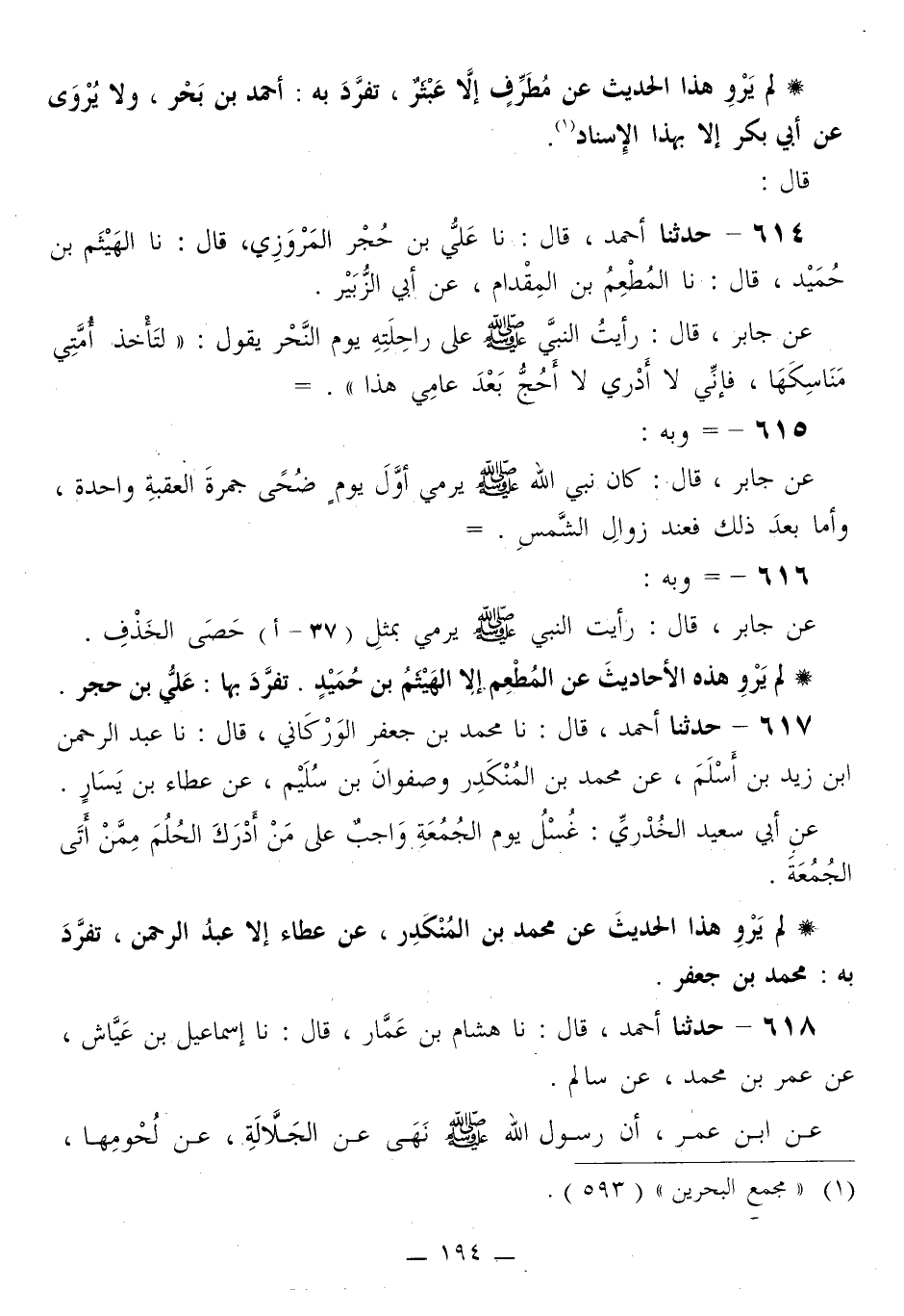 614 - حَدَّثَنَا أَحْمَدُ قَالَ: نا عَلِيُّ بْنُ حُجْرٍ الْمَرْوَزِيُّ قَالَ: نا الْهَيْثَمُ بْنُ حُمَيْدٍ قَالَ: نا الْمُطْعِمُ بْنُ الْمِقْدَامِ، عَنْ أَبِي الزُّبَيْرِ، عَنْ جَابِرٍ قَالَ: رَأَيْتُ النَّبِيَّ صَلَّى اللهُ عَلَيْهِ وَسَلَّمَ عَلَى رَاحِلَتِهِ يَوْمَ النَّحْرِ يَقُولُ: «§لِتَأْخُذْ أُمَّتِي مَنَاسِكَهَا، فَإِنِّي لَا أَدْرِي لَعَلِّي لَا أَحُجُّ بَعْدَ عَامِي هَذَا»