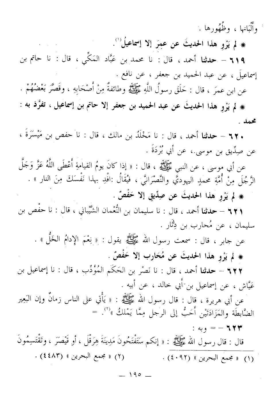 619 - حَدَّثَنَا أَحْمَدُ قَالَ: نا مُحَمَّدُ بْنُ عَبَّادٍ الْمَكِّيُّ قَالَ: نا حَاتِمُ بْنُ إِسْمَاعِيلَ، عَنْ عَبْدِ الْحَمِيدِ بْنِ جَعْفَرٍ، عَنْ نَافِعٍ، عَنِ ابْنِ عُمَرَ قَالَ: «§حَلَقَ رَسُولُ اللَّهِ صَلَّى اللهُ عَلَيْهِ وَسَلَّمَ وَطَائِفَةٌ مِنْ أَصْحَابِهِ، وَقَصَّرَ بَعْضُهُمْ»