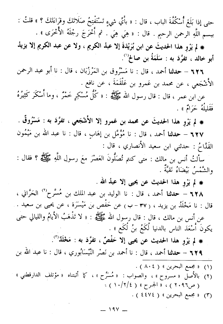 626 - حَدَّثَنَا أَحْمَدُ قَالَ: نا مَسْرُوقُ بْنُ الْمَرْزُبَانِ قَالَ: نا أَبُو عَبْدِ الرَّحْمَنِ الْأَشْجَعِيُّ، عَنْ مُحَمَّدِ بْنِ عَمْرِو بْنِ عَلْقَمَةَ، عَنْ نَافِعٍ، عَنِ ابْنِ عُمَرَ قَالَ: قَالَ رَسُولُ اللَّهِ صَلَّى اللهُ عَلَيْهِ وَسَلَّمَ: «§كُلُّ مُسْكِرٍ خَمْرٌ، وَمَا أَسْكَرَ كَثِيرُهُ فَقَلِيلُهُ حَرَامٌ»