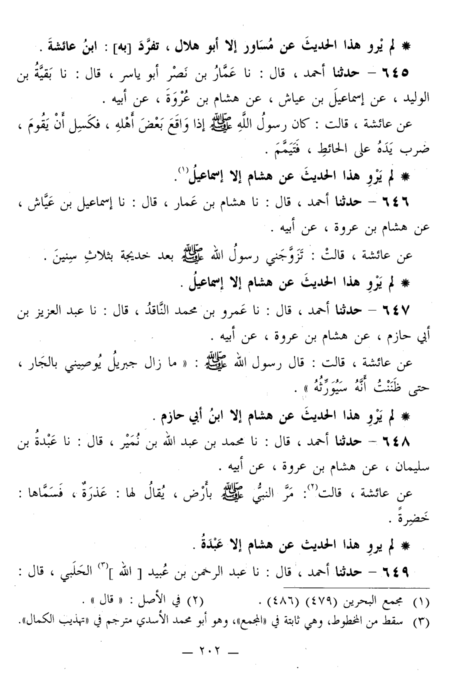 646 - حَدَّثَنَا أَحْمَدُ قَالَ: نا هِشَامُ بْنُ عَمَّارٍ قَالَ: نا إِسْمَاعِيلُ بْنُ عَيَّاشٍ، عَنْ هِشَامِ بْنِ عُرْوَةَ، عَنْ أَبِيهِ، عَنْ عَائِشَةَ، قَالَتْ: «§تَزَوَّجَنِي رَسُولُ اللَّهِ صَلَّى اللهُ عَلَيْهِ وَسَلَّمَ بَعْدَ خَدِيجَةَ بِثَلَاثِ سِنِينَ»