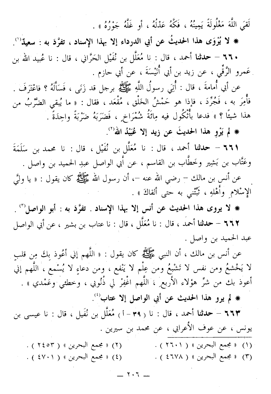 662 - حَدَّثَنَا أَحْمَدُ قَالَ: نا مُعَلَّلٌ قَالَ: نا عَتَّابُ بْنُ بُشَيْرٍ، عَنْ أَبِي الْوَاصِلِ عَبْدِ الْحَمِيدِ بْنِ وَاصِلٍ، عَنْ أَنَسِ بْنِ مَالِكٍ، أَنَّ النَّبِيَّ صَلَّى اللهُ عَلَيْهِ وَسَلَّمَ كَانَ يَقُولُ: «§اللَّهُمَّ إِنِّي أَعُوذُ بِكَ مِنْ قَلْبٍ لَا يَخْشَعُ وَمِنْ نَفْسٍ لَا تَشْبَعُ وَمِنْ عِلْمٍ لَا يَنْفَعُ، وَمِنْ دُعَاءٍ لَا يُسْمَعُ، اللَّهُمَّ إِنِّي أَعُوذُ بِكَ مِنْ شَرِّ هَؤُلَاءِ الْأَرْبَعِ، اللَّهُمَّ اغْفِرْ لِي ذُنُوبِي، وَخَطَئِي وَعَمْدِي»