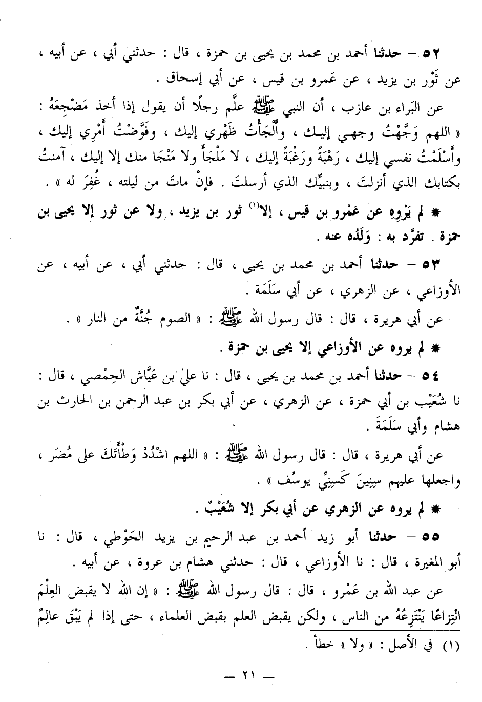 55 - حَدَّثَنَا أَبُو زَيْدٍ أَحْمَدُ بْنُ عَبْدِ الرَّحِيمِ بْنِ زَيْدٍ الْحَوْطِيُّ قَالَ: نا أَبُو الْمُغِيرَةِ قَالَ: نا الْأَوْزَاعِيُّ قَالَ: حَدَّثَنِي هِشَامُ بْنُ عُرْوَةَ، عَنْ أَبِيهِ، عَنِ عَبْدِ اللَّهِ بْنِ عَمْرٍو قَالَ: قَالَ رَسُولُ اللَّهِ صَلَّى اللهُ عَلَيْهِ وَسَلَّمَ: «إِنَّ §اللَّهَ لَا يَقْبِضُ الْعِلْمَ انْتِزَاعًا يَنْتَزِعُهُ مِنَ النَّاسِ، وَلَكِنْ يَقْبِضُ الْعِلْمَ بِقَبْضِ الْعُلَمَاءِ، حَتَّى إِذَا لَمْ يَبْقَ عَالِمٌ -[22]- اتَّخَذَ النَّاسُ رُءُوسًا جُهَّالًا، فَسُئِلُوا، فَأَفْتَوْا بِغَيْرِ عِلْمٍ، فَضَلُّوا وَأَضَلُّوا» كَذَا حَدَّثَنَا أَبُو زَيْدٍ بِهَذَا الْحَدِيثِ مُتَّصِلَ الْإِسْنَادِ، عَنْ عَبْدِ اللَّهِ بْنِ عَمْرٍو حَدَّثَنَا أَحْمَدُ بْنُ عَبْدِ الْوَهَّابِ بْنِ نَجْدَةَ قَالَ: نا أَبُو الْمُغِيرَةِ قَالَ: نا الْأَوْزَاعِيُّ، عَنْ هِشَامِ بْنِ عُرْوَةَ، عَنْ أَبِيهِ، عَنِ النَّبِيِّ صَلَّى اللهُ عَلَيْهِ وَسَلَّمَ، ولَمْ يَذْكُرْ فِي الْإِسْنَادِ: عَبْدَ اللَّهِ بْنَ عَمْرٍو