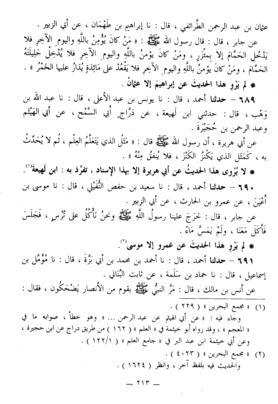 689 - حَدَّثَنَا أَحْمَدُ قَالَ: نا يُونُسُ بْنُ عَبْدِ الْأَعْلَى قَالَ: نا عَبْدُ اللَّهِ بْنُ وَهْبٍ قَالَ: حَدَّثَنِي ابْنُ لَهِيعَةَ، عَنْ دَرَّاجٍ أَبِي السَّمْحِ، عَنْ أَبِي الْهَيْثَمِ، وَعَبْدِ الرَّحْمَنِ بْنِ حُجَيْرَةَ، عَنْ أَبِي هُرَيْرَةَ، أَنَّ رَسُولَ اللَّهِ صَلَّى اللهُ عَلَيْهِ وَسَلَّمَ قَالَ: «§مَثَلُ الَّذِي يَتَعَلَّمُ الْعِلْمَ، ثُمَّ لَا يُحَدِّثُ بِهِ، كَمَثَلِ الَّذِي يَكْنِزُ الْكَنْزَ، فَلَا يُنْفِقُ مِنْهُ»