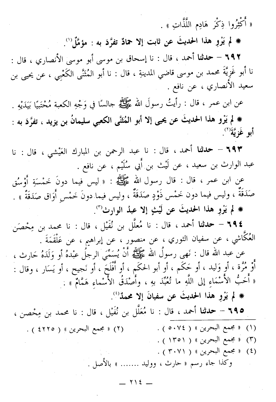 694 - حَدَّثَنَا أَحْمَدُ قَالَ: نا مُعَلَّلُ بْنُ نُفَيْلٍ قَالَ: نا مُحَمَّدُ بْنُ مِحْصَنٍ الْعُكَّاشِيُّ، عَنْ سُفْيَانَ الثَّوْرِيِّ، عَنْ مَنْصُورٍ، عَنْ إِبْرَاهِيمَ، عَنْ عَلْقَمَةَ، عَنْ عَبْدِ اللَّهِ قَالَ: «نَهَى رَسُولُ اللَّهِ صَلَّى اللهُ عَلَيْهِ وَسَلَّمَ أَنْ يُسَمِّيَ الرَّجُلُ عَبْدَهُ أَوْ وَلَدَهُ حَارِثُ، أَوْ مُرَّةُ، أَوْ وَلِيدٌ، أَوْ حَكَمٌ، أَوْ أَبُو الْحَكَمِ، أَوْ أَفْلَحُ، أَوْ نَجِيحٌ، أَوْ يَسَارٌ، وَقَالَ:» §أَحَبُّ الْأَسْمَاءِ إِلَى اللَّهِ مَا تُعُبُّدَ بِهِ، وَأَصْدَقُ الْأَسْمَاءِ هَمَّامٌ ". لَمْ يَرْوِ هَذَا الْحَدِيثَ عَنْ سُفْيَانَ إِلَّا مُحَمَّدٌ