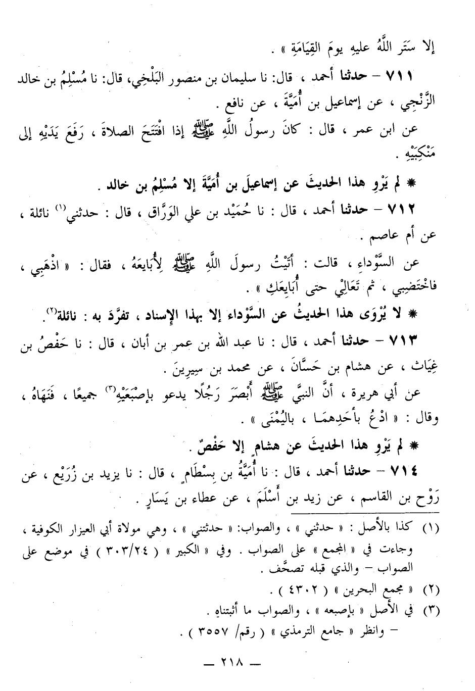 712 - حَدَّثَنَا أَحْمَدُ قَالَ: نا حُمَيْدُ بْنُ عَلِيٍّ الْوَرَّاقُ قَالَ: حَدَّثتْنِي نَائِلَةُ، عَنْ أُمِّ عَاصِمٍ، عَنِ السَّوْدَاءِ، قَالَتْ: أَتَيْتُ رَسُولَ اللَّهِ صَلَّى اللهُ عَلَيْهِ وَسَلَّمَ لِأُبَايِعَهُ، فَقَالَ: «§اذْهَبِي، فَاخْتَضِبِي، ثُمَّ تَعَالَيْ حَتَّى أُبَايِعَكِ»