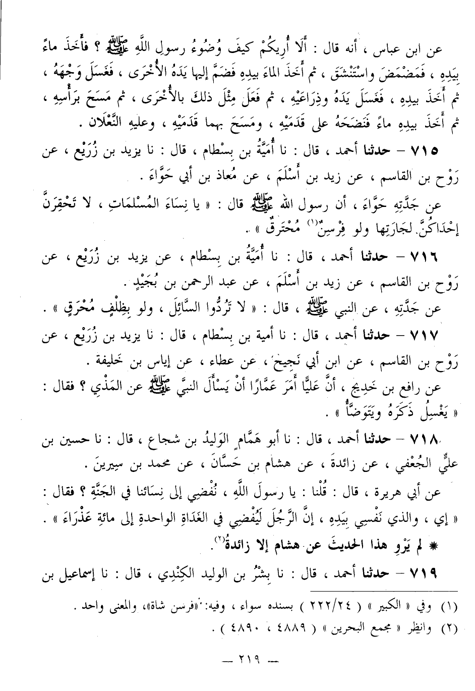 718 - حَدَّثَنَا أَحْمَدُ قَالَ: نا أَبُو هَمَّامٍ الْوَلِيدُ بْنُ شُجَاعٍ قَالَ: نا حُسَيْنُ بْنُ عَلِيٍّ الْجُعْفِيُّ، عَنْ زَائِدَةَ، عَنْ هِشَامِ بْنِ حَسَّانَ، عَنْ مُحَمَّدِ بْنِ سِيرِينَ، عَنْ أَبِي هُرَيْرَةَ قَالَ: قُلْنَا: يَا رَسُولَ اللَّهِ، نُفْضِي إِلَى نِسَائِنَا فِي الْجَنَّةِ؟ فَقَالَ: «إِي وَالَّذِي نَفْسِي بِيَدِهِ، إِنَّ §الرَّجُلَ لَيُفْضِي فِي الْغَدَاةِ الْوَاحِدَةِ إِلَى مِائَةِ عَذْرَاءَ»