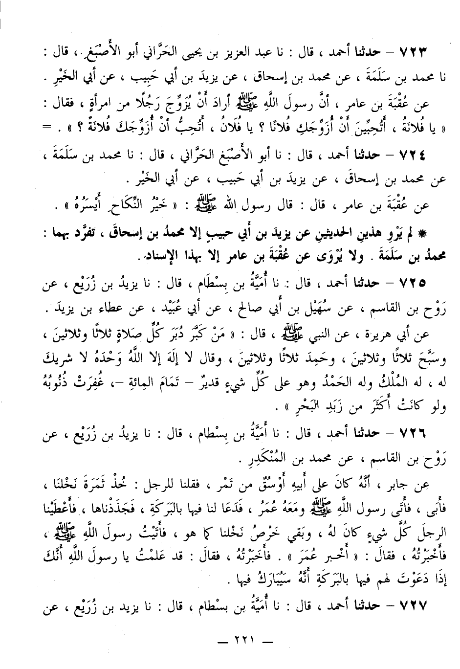 724 - حَدَّثَنَا أَحْمَدُ قَالَ: نا أَبُو الْأَصْبَغِ الْحَرَّانِيُّ قَالَ: نا مُحَمَّدُ بْنُ سَلَمَةَ، عَنْ مُحَمَّدِ بْنِ إِسْحَاقَ، عَنْ يَزِيدَ بْنِ أَبِي حَبِيبٍ، عَنْ أَبِي الْخَيْرِ، عَنْ عُقْبَةَ بْنِ عَامِرٍ قَالَ: قَالَ رَسُولُ اللَّهِ صَلَّى اللهُ عَلَيْهِ وَسَلَّمَ: «§خَيْرُ النِّكَاحِ أَيْسَرُهُ»