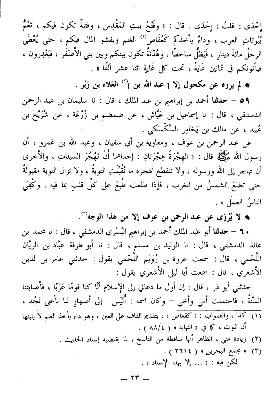 59 - حَدَّثَنَا أَحْمَدُ بْنُ إِبْرَاهِيمَ بْنِ عَبْدِ الْمَلِكِ قَالَ: نا سُلَيْمَانُ بْنُ عَبْدِ الرَّحْمَنِ الدِّمَشْقِيُّ قَالَ: نا إِسْمَاعِيلُ بْنُ عَيَّاشٍ، عَنْ ضَمْضَمِ بْنِ زُرْعَةَ، عَنْ شُرَيْحِ بْنِ عُبَيْدٍ، عَنْ مَالِكِ بْنِ يُخَامِرَ السَّكْسَكِيِّ، عَنْ عَبْدِ الرَّحْمَنِ بْنِ عَوْفٍ، وَمُعَاوِيَةَ بْنِ أَبِي سُفْيَانَ، وَعَبْدِ اللَّهِ بْنِ عَمْرٍو، أَنَّ رَسُولَ اللَّهِ صَلَّى اللهُ عَلَيْهِ وَسَلَّمَ قَالَ: «§الْهِجْرَةُ هِجْرَتَانِ: إِحْدَاهُمَا أَنْ تَهْجُرَ السَّيِّئَاتِ، وَالْأُخْرَى أَنْ تُهَاجِرَ إِلَى اللَّهِ وَرَسُولِهِ، وَلَا تَنْقَطِعُ الْهِجْرَةُ مَا تُقُبِّلَتِ التَّوْبَةُ، وَلَا تَزَالُ التَّوْبَةُ مَقْبُولَةً حَتَّى تَطْلُعَ الشَّمْسُ مِنَ الْمَغْرِبِ، فَإِذَا طَلَعَتْ طُبِعَ عَلَى كُلِّ قَلْبٍ بِمَا فِيهِ. وَكُفِيَ النَّاسُ الْعَمَلَ»