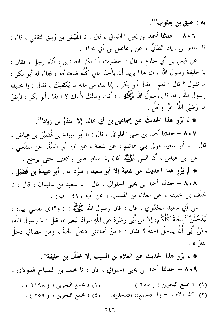 808 - حَدَّثَنَا أَحْمَدُ بْنُ يَحْيَى الْحُلْوَانِيُّ قَالَ: نا سَعِيدُ بْنُ سُلَيْمَانَ قَالَ: نا خَلَفُ بْنُ خَلِيفَةَ، عَنِ الْعَلَاءِ بْنِ الْمُسَيَّبِ، عَنْ أَبِيهِ، عَنْ أَبِي سَعِيدٍ الْخُدْرِيِّ قَالَ: قَالَ رَسُولُ اللَّهِ صَلَّى اللهُ عَلَيْهِ وَسَلَّمَ: «وَالَّذِي نَفْسِي بِيَدِهِ، لَيَدْخُلَنَّ الْجَنَّةَ كُلُّكُمْ، إِلَّا مَنْ أَبَى وشَرَدَ عَلَى اللَّهِ شِرَادَ الْبَعِيرِ» ، قِيلَ: يَا رَسُولَ اللَّهِ، وَمَنْ أَبَى أَنْ يَدْخُلَ الْجَنَّةَ؟ فَقَالَ: «§مَنْ أَطَاعَنِي دَخَلَ الْجَنَّةَ، وَمَنْ عَصَانِي دَخَلَ النَّارَ»