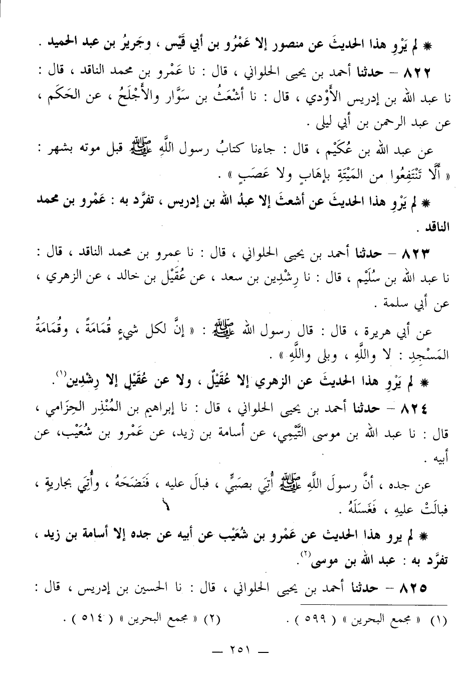 822 - حَدَّثَنَا أَحْمَدُ بْنُ يَحْيَى الْحُلْوَانِيُّ قَالَ: نا عَمْرُو بْنُ مُحَمَّدٍ النَّاقِدُ قَالَ: نا عَبْدُ اللَّهِ بْنُ إِدْرِيسَ الْأَوْدِيُّ قَالَ: نا أَشْعَثُ بْنُ سَوَّارٍ الْأَجْلَحُ، عَنِ الْحَكَمِ، عَنْ عَبْدِ الرَّحْمَنِ بْنِ أَبِي لَيْلَى، عَنْ عَبْدِ اللَّهِ بْنِ عُكَيْمٍ قَالَ: جَاءَنَا كِتَابُ رَسُولِ اللَّهِ صَلَّى اللهُ عَلَيْهِ وَسَلَّمَ قَبْلَ مَوْتِهِ بِشَهْرٍ: «§أَلَا تَنْتَفِعُوا مِنَ الْمَيْتَةِ بِإِهَابٍ وَلَا عَصْبٍ»